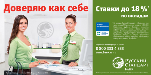 Банк "Русский стандарт" поддержал новый дизайн рекламойСтартовала рекламная кампания по депозитам"Доверяю как себе": с этим слоганом и свежим дизайном, выполненном в салатовых тонах, 1 июня 2009 года стартовала летняя кампания Банка Русский Стандарт по поддержке новой линейки депозитов. Летнее настроение поддерживает не только яркое позиционирование, но и лицо кампании - известная модель, телеведущая и лицо национального конкурса красоты "Мисс Россия", обладательница титулов Вице-Мисс Россия-2007 и Вице-Мисс Вселенная-2008 - Вера Красова. Слоган кампании подчеркивает важнейший принцип работы Банка Русский Стандарт с клиентами: доверие клиентов - это самое ценное. Летняя кампания призвана обратить внимание клиентов на изменения в линейке депозитных продуктов Банка. Федеральная кампания пройдет на таких носителях, как наружная реклама (щиты 6х3), метро (7 городов) и пресса (КП и АиФ). |