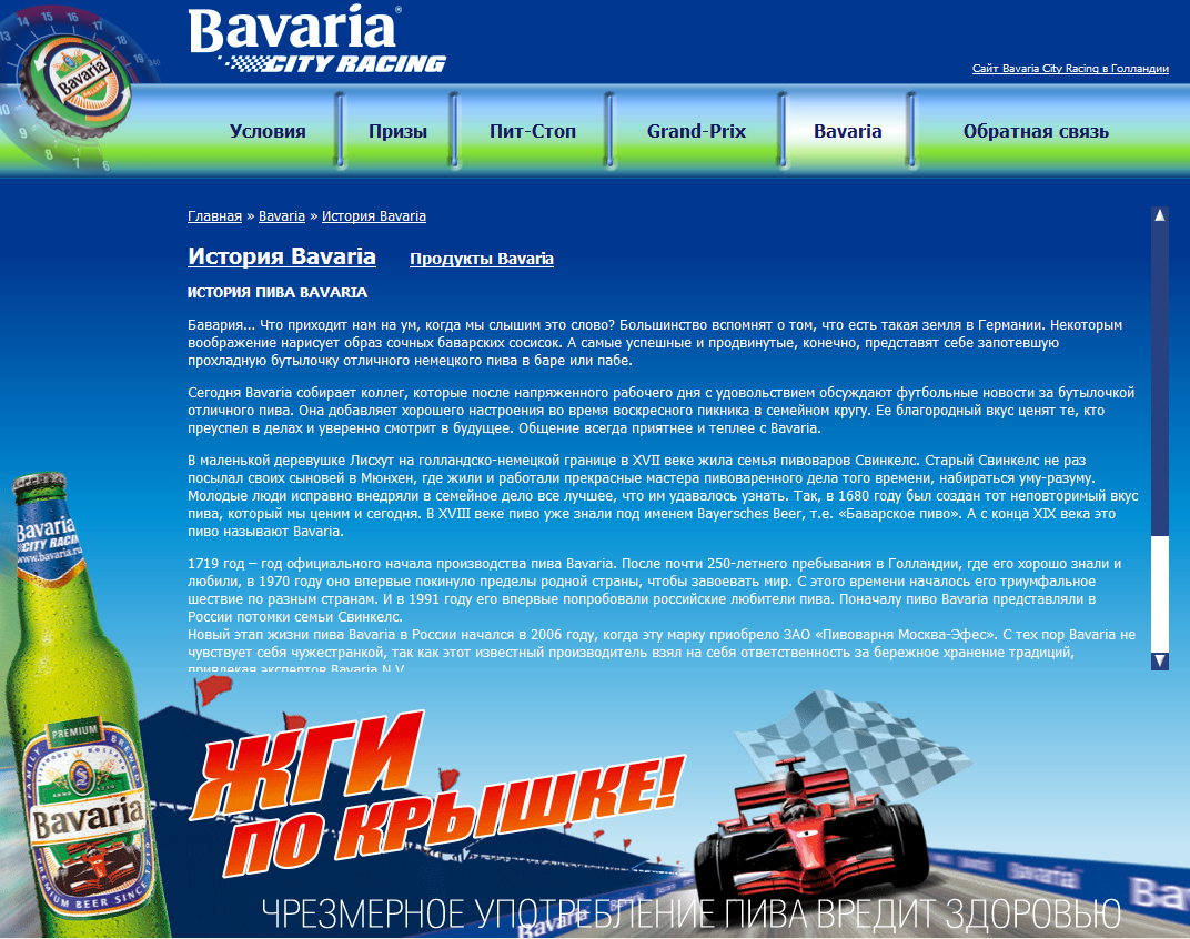 Bavaria готовится к московским заездам «Формулы 1»1 июня 2009 г. стартовала национальная интегрированная промо кампания «Bavaria City Racing. Жги по Крышке», которая ознаменована двумя мероприятиями лета: Bavaria Moscow City Racing 19 июля и Bavaria City Racing в Роттердаме 16 августа. Ролик в поддержку событий разработан рекламным агентством Instinct. Ежегодно знаменитый пивной бренд Bavaria организует заезды болидов Формулы 1 в Москвею Каждая крышка от пива Bavaria с промо кодом даёт возможность получить гоночные призы – бокал победителя и экипировку (поло, куртку, шлем). Каждый код участвует в розыгрыше главных призов – поездок на двоих на международное гоночное шоу Bavaria City Racing, которое состоится 16 августа в Роттердаме. Этим летом 19 июля в самом центре Москвы второй год подряд состоится грандиозное автомобильное шоу Bavaria Moscow City Racing, в котором примут участие более ста машин гоночных серий, а кульминацией станут показательные заезды машин нескольких команд Формулы В рамках интегрированной рекламной кампании «Bavaria City Racing. Жги по Крышке» задействовано несколько инструментов. Была изготовлена специальная промо упаковка – бутылка Bavaria Premium с промо кодом, а также лимитированный тираж банки Bavaria Premium, которую можно будет купить только в московском регионе. Специальную упаковку украшает красный гоночный болид. На федеральных каналах транслируется ролик длительностью 30 секунд, а также его 10-секундная версия. На улицах размещены билборды 3х6 и других форматов. В интернете - баннеры на популярных ресурсах. Открыт сайт www.bavaria.ru. Промо для потребителей в точках продаж – крупных сетях и супермаркетах 6 городов. Размещены нестандартные конструкции в виде гоночных болидов в крупных торговых центрах Москвы Все элементы коммуникации выполнены в стилистике Сити Рейсинга, динамичный дизайн украшает гоночная атрибутика и красный болид Формулы 1, один из тех, что можно будет увидеть на трассе вокруг Кремля и в Роттердаме на Bavaria City Racing. Основная идея оригинального ТВ ролика – гонки пробок Bavaria. После зеленого сигнала светофора, начинается настоящая гонка. С ревом двигателей настоящих болидов пробки несутся по барной стойке, слегка влажной, как трасса после дождя, маневрируя среди бутылок и бокалов с холодным пивом Bavaria. Ролик подчеркивает дух бренда Bavaria – современный, динамичный, узнаваемый и премиальный, ведь только под флагом пива высшей пробы могут пройти королевские гонки в центре столицы. Состав творческой группы Заказчик: ЗАО «Пивоварня Москва-Эфес» Директор по маркетингу: Берке Кардеш Менеджер по маркетингу: Алена Храмова Руководитель бренда: Александр Леонов Специалист по маркетингу: Мария Матлак