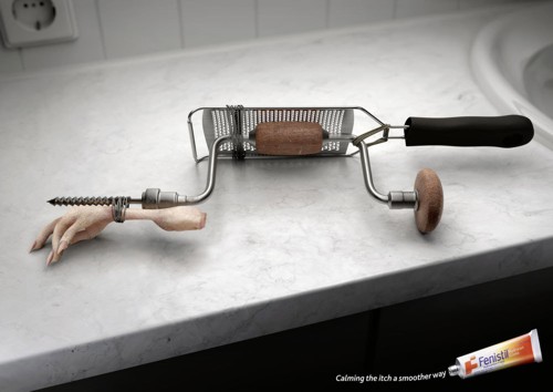Fenistil: когда аллергия как пыткаПредметы, которые немецкие креаторы из агентства Saatchi & Saatchi изобразили на принтах, на первый взгляд похожи на страшные орудия пыток, но на самом деле это хитроумные приспособления для облегчения кожного зуда, вызванного различными причинами. Создатели кампании утверждают, что намного эффективнее и спокойнее с проблемой кожного зуда справится противоаллергическое и противозудное средство Fenistil производства транснациональной фармацевтической корпорации Novartis International AG.Слоган: "Успокоит зуд более спокойным способом." Агентство: Saatchi & Saatchi, Германия Творческий директор: Mark Karatas Арт-директор: Heike Erdelmeier Копирайтер: Kinga Komora 3D: Lars Zimmermann Другое: Lars Zimmermann Тем временем в России размещается совсем другая реклама бренда "Фенистил". По телевидению транслируется адаптированный ролик - куда более добрый, нежели приведенные выше принты. В ролике мама спасает сына от зуда с помощью геля. А растерявший ребенок не понимает, куда подевалась его чесотка. |