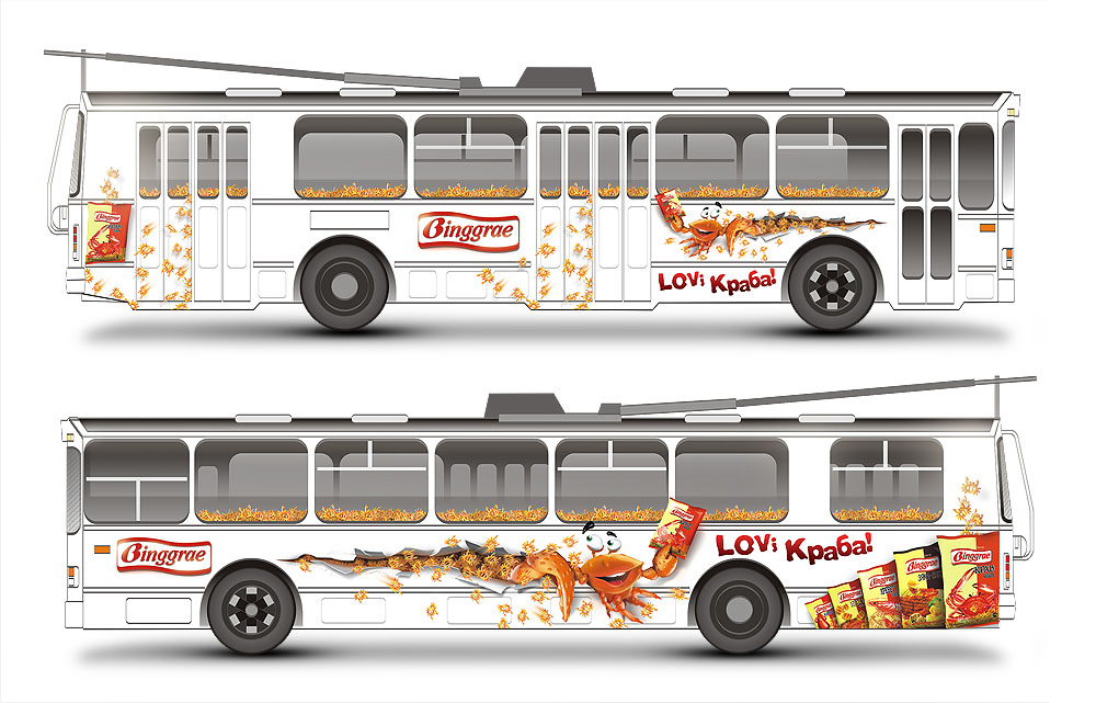 Троллейбус-крабПроизводитель снековой продукции, южно-корейская компания Binggrae, планируя рекламную кампанию в восьми городах России, обратилась в агентство RECLUB. Перед агентством была поставлена задача: разработать и создать для размещения на автобусах и троллейбусах новый, яркий сюжет приключений фирменного персонажа - краба, сохранив при этом прошлогодний слоган: "Lovi краба!".Был создан ряд идей, из которых клиент выбрал одну: краб "ездит" по городу, "открывает" автобусы как пачки, а пассажиры брендированного транспорта со стороны будто "купаются" в чипсах. Руководитель проекта: Серж Лукас Креативный продюсер: Михаил Надымов Дизайнер: Вова Кучин Технический дизайнер: Слава Степанов Менеджер проекта: Анна Мирончук |