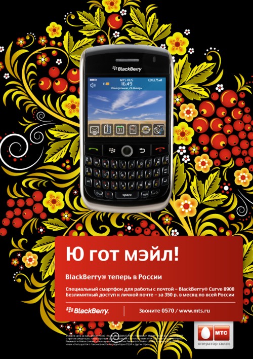 МТС срывает ягодки с BlackBerryИдея АМК Znamenka воплощена в прессе и интернетеОдин из крупнейших сотовых операторов - МТС - запустил рекламную кампанию в поддержку услуги BlackBerry Internet Service (BIS) - популярного во всем мире решения для работы с личной электронной почтой, о запуске которой в России Sostav.ru сообщал ранее. На западном рынке BlackBerry можно назвать одним из самых лояльных к креативу рекламодателей - они поддерживают награды MTV, устраивают шумные PR-акции и активно размещаются в наружной рекламе. Одна из самых заметных немецких кампаний BlackBerry состоялась в 2006 году, когда в Берлине появился кубический стенд с необычными POS-материалами - любой желающий мог взять бумажный аппарат с собой. В США прошлогодняя предвыборная гонка стала элементом PR-акции аппарата BlackBerry. На многочисленных предвыборных фотографиях тогда еще будущий президент Барак Обама держал в руках аппарат BlackBberry, с которым не смог расстаться и после победы. По закону США, президент не должен иметь личную корреспонденцию и средства связи, но Обама, который (как пишет New York Times .) привык к аппарату за годы использования, не согласился расстаться с ним. Проблема решилась довольно быстро - была найдена поправка в конституции, которая позволила Обаме оставить BlackBerry у себя, но на некоторое время газеты пестрили заголовками вида "Обама любит свой BlackBerry". При этом, в телеролике был использован образ Джона МакКейна (второго кандидата в президенты США 2008, соперника Обамы) - набор не самых логичных фраз МакКейна выставляет его не самым одаренным политиком, а слоган - "Вы смотрите на чудо, которое МакКейн помог создать" намекает на простоту использования BlackBerry (якобы с таким аппаратом справится человек с любым уровнем интеллекта). В России же компания МТC решила продвигать BlackBerry исключительно в прессе (деловые, глянцевые и развлекательные издания) и интернете (почтовые, бизнес и развлекательные площадки). Как сообщили в пресс-службе, были выбраны наиболее релевантные каналы для выхода на целевую аудиторию продукта. Кампанию, рассчитанную как на частных, так и на корпоративных абонентов, разработало АМК Znamenka, перекупленное недавно группой Havas у Группы АДВ. Воплощением баннеров занималось агентство Avdert - интернет-подрядчик АМК Znamenka. Под каждый сегмент было разработано собственное креативное решение. Как сообщает пресс-служба ОАО "Мобильные ТелеСистемы", кампания для частных клиентов использует образ "пришествия" культового почтового инструмента в Россию: аппарат BlackBerry представлен на контрастном сочетании традиционного для России жостовского узора и транслитирированной ключевой фразы, поступающей при получении электронного почтового сообщения.