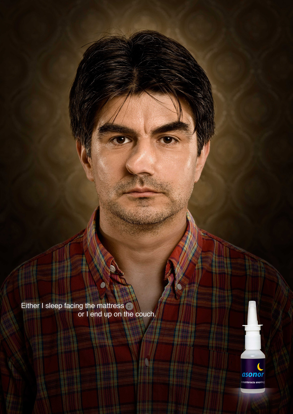 Asonor - для тех, у кого сплюснута головаПочему мы храпим? Храп возникает при препятствиях дыханию, которые могут вызываться простудой или анатомическими изменениями носа или рта. Однако наиболее частой причиной храпа является чрезмерное расслабление мышц в области глотки во время сна. В результате вход в глотку сужается, что затрудняет прохождение воздуха.Сегодня румынское агентство The Secret Service представляет вниманию ЦА немецкое средство Asonor (Асонор), которое устраняет основную причину храпа, увлажняя и смягчая слизистую и подтягивая мышцы мягкого неба. Как рассказывают креаторы из Бухареста, женщины заставляют бедных мужчин спать либо на боку, либо лицом на матрасе… Изменить эту ситуацию как раз и поможет Asonor. Слоган: "Либо я сплю лицом на матрасе, либо придется, в конце концов, уйти на диван. Она заставляет меня спать не боку всю мою жизнь. Asonor. Нейтрализует храп". Агентство: The Secret Service, Бухарест, Румыния Творческий директор: Mihai Ene Арт-директор: Dragos Gheorghiu Копирайтер: Mihai Ene Фотограф: Dan Samoila |