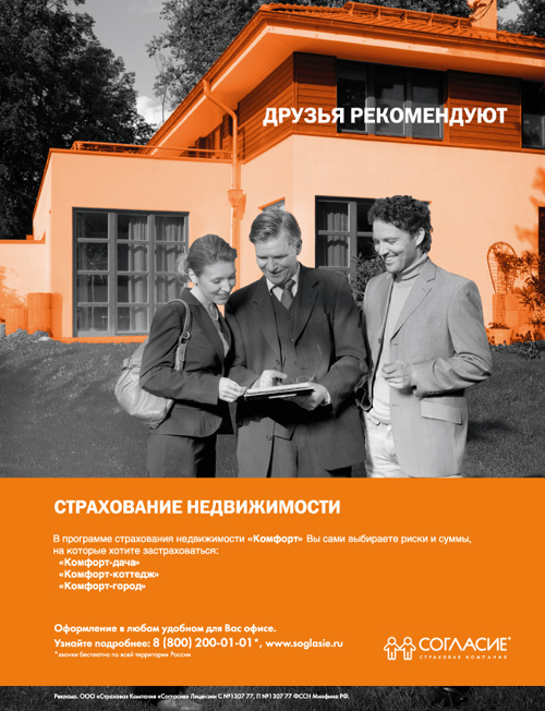 Друзья согласныРекламная кампания СК "Согласие" от "MATRIX"Рекламное агентство "MATRIX" проводит рекламную кампанию страховой компании "Согласие". В результате исследования было выявлено, что большинство клиентов страховых компаний руководствуются рекомендациями референтной группы (мнением друзей и знакомых). Агентство разработало новую концепцию позиционирования - "Друзья рекомендуют", а также коммуникационную стратегию и креатив по 4 продуктам. Рекламная кампания стартовала во второй половине мая, её первый этап продлится до сентября. Основная задача - сформировать новый имидж бренда и повысить его узнаваемость. Также размещение запланировано в федеральной и региональной прессе, в Интернете, на радио, а также в наружной рекламе. Состав творческой группы Агентство "MATRIX" Директор по маркетингу и стратегическому планированию - Александр Альперин Медиа директор - Вера Красулина Креативный директор - Мария Захарова Арт-директор - Александр Корниенко Копирайтер - Иван Зюбанов Руководитель медиа группы - Ирина Степанова Директор по работе с клиентами - Инна Нахшунова Эккаунт менеджер - Павел Шилов Фотограф - Frank Herfort Страховая компания Согласие Руководитель отдела общественных связей и рекламы - Полянская Яна Начальник отдела маркетинга - Антонова Ольга |