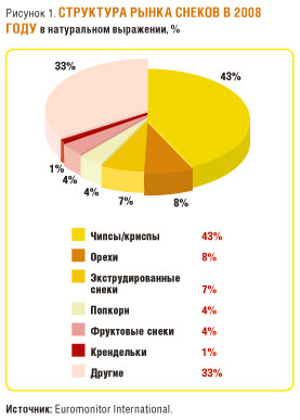 Снеки всегда пользовались популярностью у российских потребителей. Несмотря на традицию трехразового питания, россияне предпочитают перекусывать в течение рабочего дня и после него, на отдыхе и во время общения с другими людьми. Хотя расходы среднего потребителя на упакованную снековую продукцию в России существенно ниже по сравнению с другими восточноевропейскими странами, темпы роста потребления этой продукции выражаются двузначными цифрами во всех подсегментах рынка. Подушевой расход на сладкие и питательные снеки: фруктовые снеки, картофельные чипсы/криспы, кукурузные чипсы, экструдированные снеки, попкорн, соленые крендельки, орешки и другие – в 2008 году практически утроился по сравнению с 2003-м, достигнув 534 рублей в год. В России, так же как в Белоруссии, Румынии и на Украине, рост рынка сладких и питательных снеков превысил 12% в год в натуральном выражении.