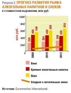 Потребление питательных снеков в значительной степени зависит от спроса на алкогольные напитки. Несмотря на то, что Россия возглавляет мировой рейтинг по потреблению водки – 12 литров в год на душу населения, – усиливается тенденция переключения россиян на менее крепкие напитки. Во многих ситуациях потребления покупатели все чаще отдают предпочтение пиву и вину, а не крепким спиртным напиткам. В западных странах слабоалкогольные напитки чаще всего потребляют вместе с солеными крендельками, орехами и чипсами, и эта традиция отлично прижилась в Восточной Европе, в том числе и в России. В период с 2008-го по 2012 год сегменты вина и слабоалкогольных напитков будут медленно расти в стоимостном выражении (рис. 2).