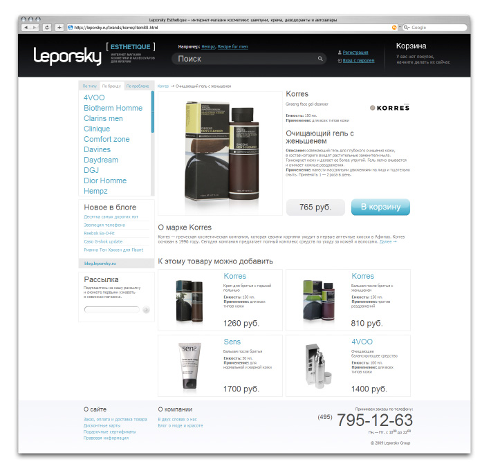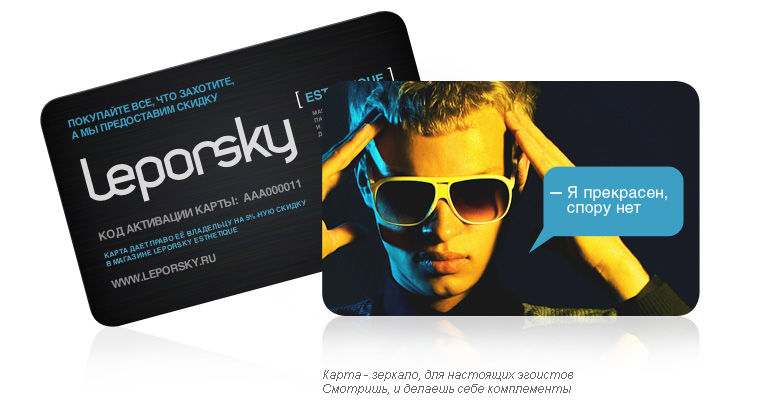 Leporsky Esthetique – новый бренд от Nile StudioLeporsky Esthetique – первый в России концептуальный магазин косметики и парфюмерии, созданный исключительно для мужчин. В рамках работы над проектом в Nile Studio было создано большое количество рекламного материала, один из них – дисконтная карта Leporsky Esthetique – забава для настоящих эгоистов. Лицевая сторона карты – это зеркальное покрытие, с наклеенным поверх комплементом самому себе. С такой картой можно любоваться собой постоянно и еще, получать скидки при покупках. Сайт бренда удобен и предельно понятен. Поиск товара можно осуществлять как по типу или по бренду, так и по проблематике мужской кожи. Отдельно к выходу готовится некоммерческий арт-проект Leporsky Esthetique – книга о самых влиятельный секс-символах XX века. В книге появятся известные каждому из нас супергерои в лицах Жана-Поля Бельмондо, Шона Коннери, Арнольда Шварценеггера, Сильвестра Сталлоне, Джона Траволты, Мэла Гибсона и др. Над проектом работали: Илья Щекуров – творческий руководитель, дизайнер Владимир Черносвитов, Алексей Черкасов – дизайнеры Евгений Поздняков – технолог Елена Охапкина – продюсер проекта |