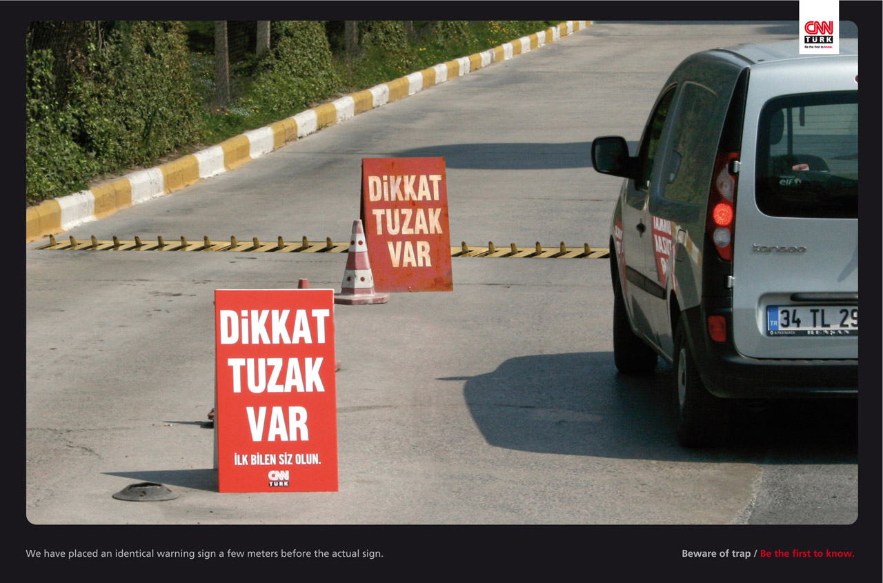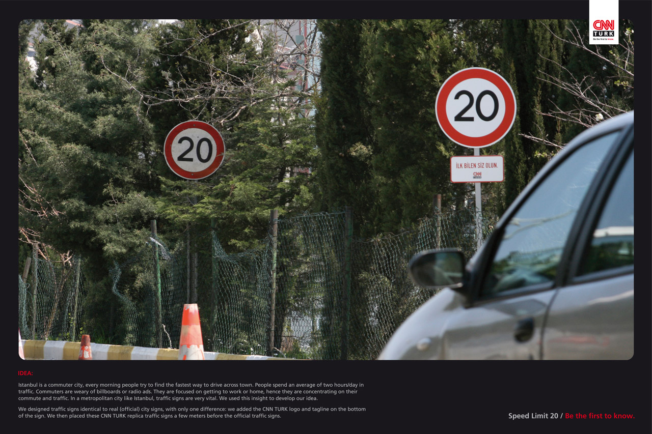 Телеканал CNN Turk продублировал дорожные знакиРанее турецкие креаторы из рекламного агентства DDB&Co. уже рассказывали ЦА о том, что новостной телеканал CNN Turk (CNN Турция) позволяет узнавать новости без промедленья. Сегодня же эта творческая группа решила расставить на улицах Стамбула дорожные знаки, дублирующие предупреждения, находящиеся на несколько метров впереди. Таким необычным образом креаторы доносят до ЦА следующее сообщение: CNN Turk не просто транслирует новости без промедления, а рассказывает о событиях еще до их наступления. Слоган: «Будь первым, кто узнает об этом». Агентство: DDB&Co., Стамбул, Турция |