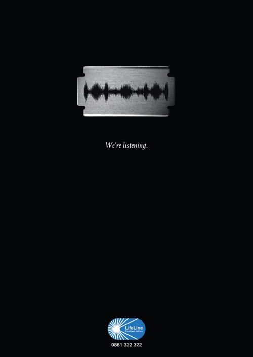 LifeLine South Africa на проводеПричин для суицида довольно много: это могут быть неурядицы в личной жизни, финансовые проблемы, проблемы со здоровьем, а также многое другое. Но часто предотвратить самостоятельное лишение себя жизни помогает задушевный разговор, для чего и существуют многочисленные кризисные линии и линии доверия. К ним относится и южноафриканская телефонная служба LifeLine South Africa, на рекламном принте для которой креаторы из Bester Burke Slingers решили изобразить бритву с прорезью, выполненной в виде звуковых волн.Слоган: "Мы слушаем. LifeLine South Africa". Агентство: Bester Burke Slingers, Кейптаун, ЮАР Фотограф: Barry White Главный творческий директор: Stephen Burke Творческий директор: Wallace Seggie Арт-директор: Riaan van Wyk Копирайтер: Jed Dawson |
