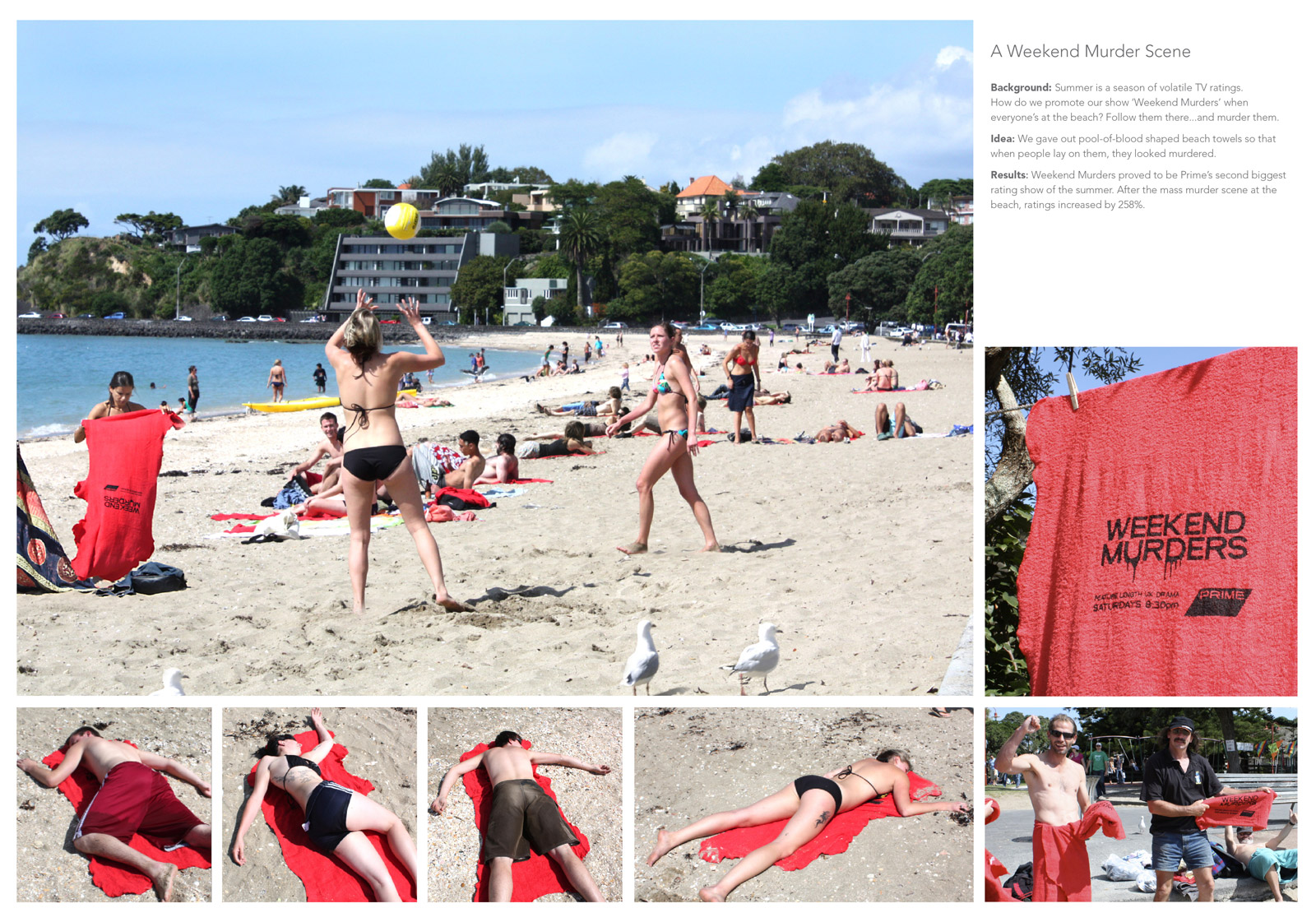 Prime TV: массовые убийства на пляжах ОклендаЕженедельное шоу Weekend Murders («Убийства по выходным») транслируется по новозеландскому телеканалу Prime TV каждую субботу в 20:30, однако в летний период телевизионные рейтинги нельзя назвать высокими. Чтобы исправить эту ситуацию креаторы из агентства DraftFCB, которые совсем недавно уже рассказывали о телесериале True Blood, пошли за потенциальными зрителями туда, где они проводят свое свободное время – на городской пляж, ну а там креаторы «убили» множество людей при помощи специальных полотенец. Агентство: DraftFCB, Окленд, Новая Зеландия |