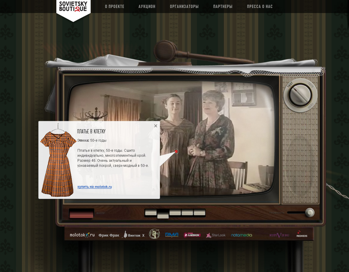 Бутик по-советскиСоциальный проект Sovietsky Boutique - настоящее интерактивное киноКреативное агентство Red Keds и шопинг-клуб KupiVIP.ru совместно с интернет-аукционом Molotok.ru запустили новый социальный проект Sovietsky Boutique - настоящее интерактивное кино. Веб-проект Sovietsky Boutique дает вам возможность стать участником виртуальной истории. В период с 28 июня по 8 июля на www.sovbut.ru рассказывается история любви, вписанная в несколько эпох советского времени. Креативная концепция сайта основана на противопоставлении редких винтажных вещей ушедшего советского периода вещам современным, которые можно купить, сделав пару кликов на сайте KupiVIP.ru. "Это не просто промосайт, это целая социальная digital-кампания, в рамках которой был разработан бренд, сайт, фильм, спецпроекты, - рассказывает Василий Лебедев, руководитель проекта. - Агентством была проведена огромная работа: мы не только придумали идею и разработали промосайт, но и полностью осуществили весь продакшн - написали сценарий, провели кастинг актеров, организовали съемки, отсняли весь необходимый материал и т.д. В процессе создания "Советского Бутика" участвовало большое количество людей, каждый из которых сделал огромный вклад в становление проекта". Помимо промосайта был разработан спецпроект на интернет-аукционе Molotok.ru. На продажу выставлены лоты со съемок видеофильма и специально найденные для проекта винтажные эксклюзивные вещи. После окончания показа истории на сайте, будет проведено финальное мероприятие, на котором пройдет церемония вручения купленных на аукционе лотов. Деньги с продажи вещей на аукционе будут направлены организаторами в Гильдию актеров кино России в поддержку ветеранов отечественной киноиндустрии. На сегодняшний день это первая в России интегрированная digital-кампания с подобным функционалом и взаимодействием флеш-сайта и интернет-аукциона. Состав творческой группы: Сайт Руководитель проекта: Василий Лебедев Креативный директор: Василий Лебедев, Виталий Быков Арт-директор: Стас Поляков, Евгений Стройнов Менеджеры: Яна Тумеркина, Оля Дорошенко Стратег: Оля Жильцова Дизайнеры: Альберт Поляков, Стас Поляков, Роман Емельянов Аниматор: Павел Сивальнев Иллюстратор: Дмитрий tebe_interesno Максимов, Мария Мясникова Программист: Ваня Брылев Главный редактор: Алина Базелюк Копирайтер: Алина Базелюк, Игорь Чаркин Техническая поддержка: компания SmartHead Фотограф: Стас Поляков, Максим Авдеев PR-менеджер: Ася Ибрагимова Со стороны KupiVIP: Оскар Хартманн, Джулианна Каспранова Со стороны Molotok.Ru: Александр Кудасов Фильм Режиссер: Анна Гарнова Продюсеры: Яна Тумеркина, Василий Лебедев Сценарий: Анна Гарнова, Василий Лебедев, Ильнур Ямилов Оператор-постановщик: Ильнур Ямилов В ролях: Клавдия Ивановна - Ирина Пулина Ваня - Владимир Гориславец Таня - Ксения Роменкова Лида - Мария Белоненко Арт-директор: Максим Демин Режиссер монтажа: Владимир Орёл Звукорежиссер: Александр Пискунов Видеоинженер: Алексей Веденичев Мастер по свету: Алексей Ильин Декоратор-постановщик: Игорь Чаркин Художник по костюмам, стилист: Ольга Жильцова Консультант по истории костюма: Ирина Гетманова Гримеры: Любовь Егорова, Марина Евсеенко Благодарим за содействие: Ирину Гетманову Светлану Хаблицкую Галину Анни Асю Ибрагимову Александра Киселева Адриана Крупчанского Ксению Макагонову Максима Авдеева