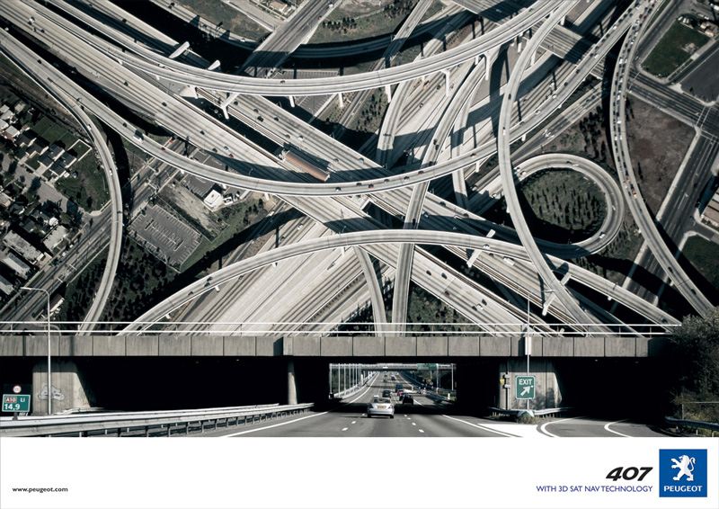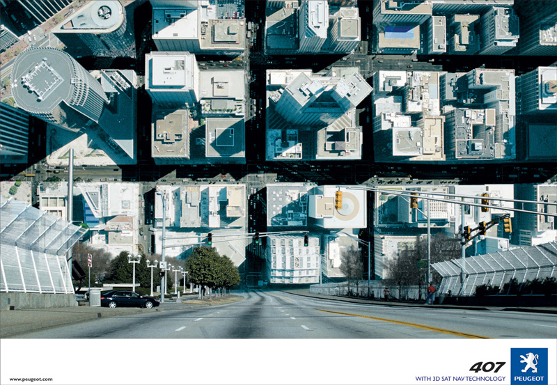 Головокружительная навигация от PeugeotThe Furnace рекламирует систему спутниковой навигации 3D Sat NavДля рекламы навигатора нового Peugeot 407 агентство разработало серию принтов с головокружительной оптической иллюзией. Одного взгляда недостаточно, чтобы разобрать, что же именно изображено на плакатах, но потом становится ясно, что на большей части картинки изображен город с высоты птичьего полета со всеми дорогами, домами и автомобилями. А в самом низу уже представлен вид глазами водителя нового "Пежо 407". Кампания подчеркивает точность и превосходную работу технологии 3D Sat Nav, которой оснащены новые автомобили серии. Состав творческой группы Agency: The Furnace Advertiser: Peugeot Project name: 3D Sat Nav Copywriter: Paul Fenton, Luke Duggan Art director: Paul Fenton, Luke Duggan Photographer: Stock, Marcus Thyer Retouching agency: Cave, Cream |