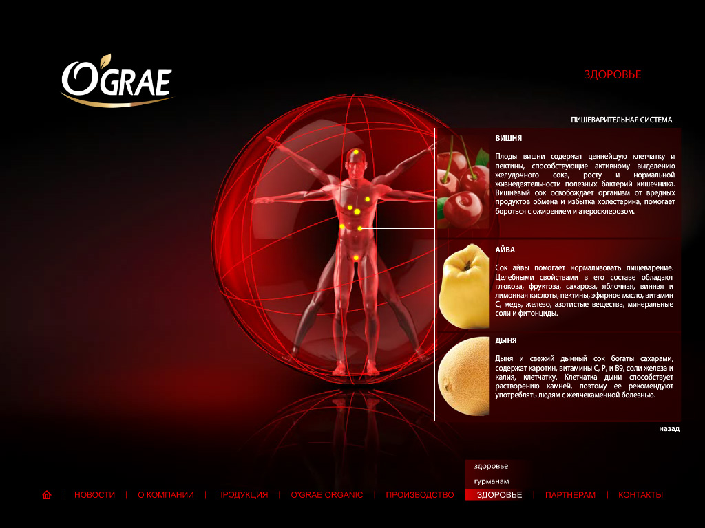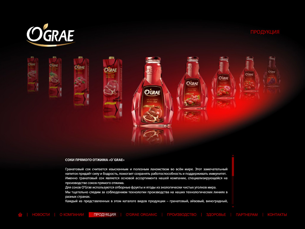 Интернет-сайт для O'Grae от SoldisАгентство Soldis Communications завершило проект по разработке сайта для компании O'GraeO'Grae производит премиальные соки прямого отжима и имеет две линейки соков - O'Grae и O'Grae BioOrganic. Сайт должен был содержать подробную информацию о продукте, но помимо информационной, иметь и имиджевую составляющую. Сайт, созданный специалистами Soldis, рассчитан на две категории посетителей: партнёров-дистрибьюторов и конечных потребителей. Ресурс рассказывает о продуктах, предлагаемых под маркой O'GRAE, об уникальной технологии производства органических соков, а также об их полезных свойствах. В основу дизайна и цветовой айдентики сайта легла общая для всех рекламных материалов бренда креативная концепция, построенная на сходстве зерна граната (гранат является флагманом соковой линейки) и драгоценного камня рубина. "Трансформации граната в рубин, переходящие в визуализацию элементов роскоши - яхт, самолётов, автомобилей, - все эти элементы работают на имидж бренда, - рассказывает ведущий web-дизайнер Soldis Дмитрий Федотов. - В создании сайта мы использовали Flash технологии, элементы 3D анимационной трансформации, а также интерактивную нелинейную анимацию". Состав творческой группы Soldis Communications Дмитрий Федотов - ведущий web-дизайнер Александр Орлов, Анна Чичеева - арт-директор Андрей Шайкин - flash аниматор Марианна Кузнецова, Наталья Юрченко - менеджер проекта |