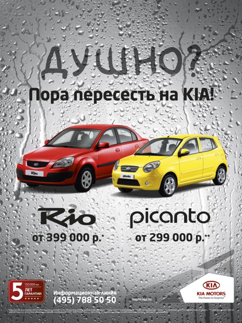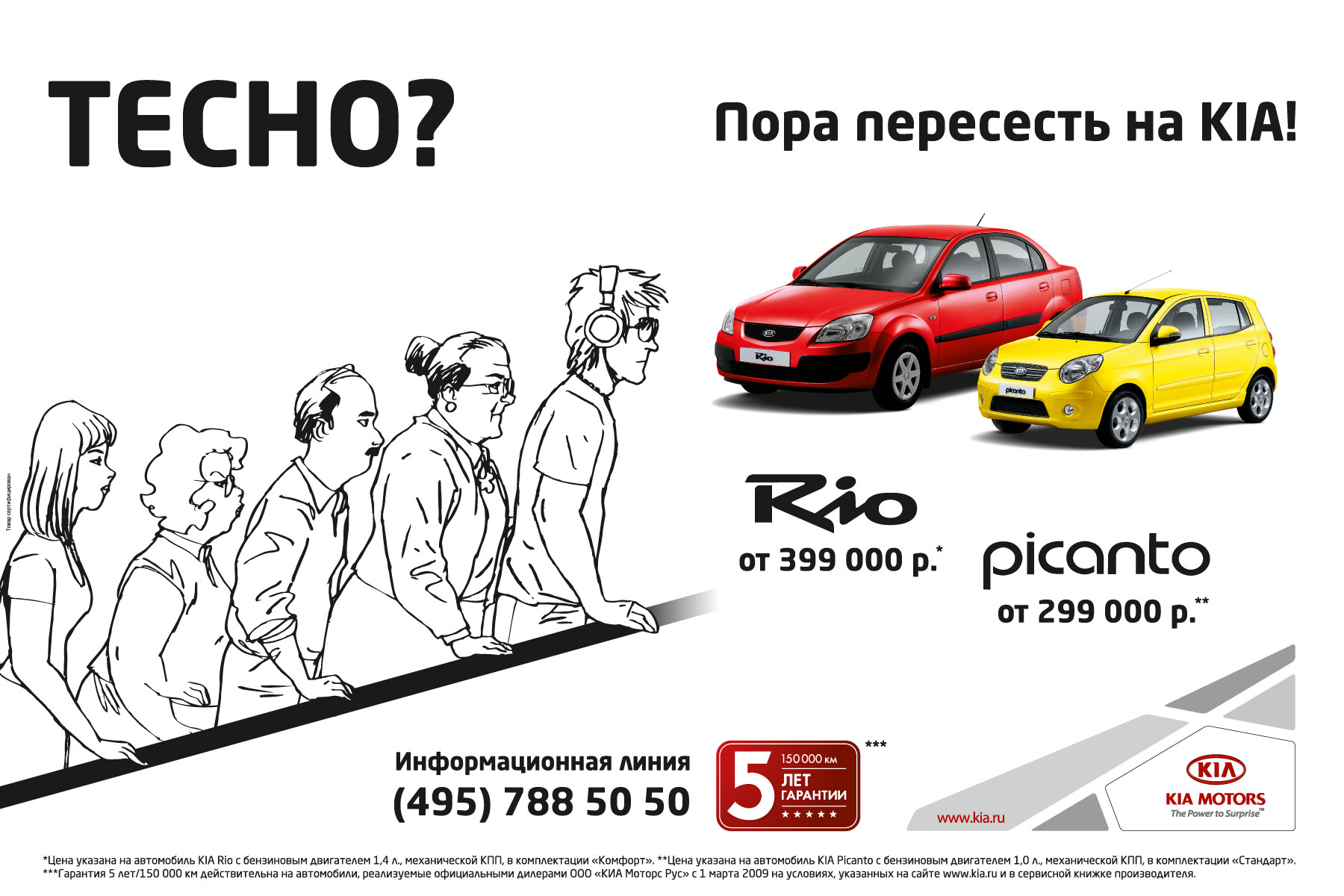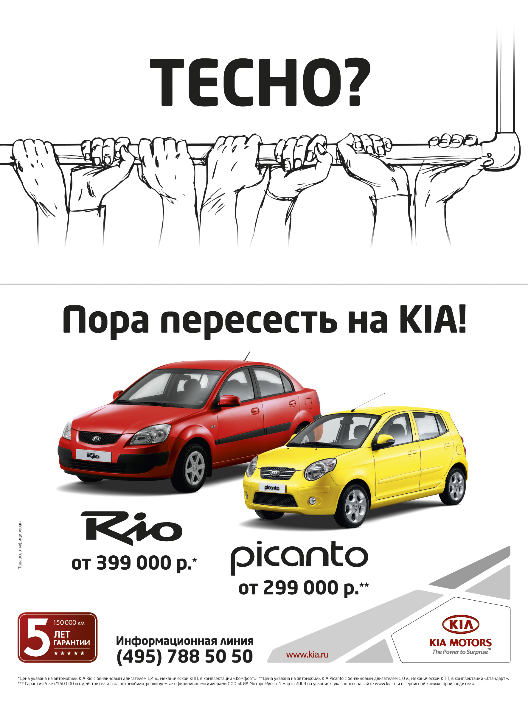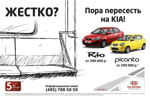Кампания в общественном транспорте бьет прямо в цель На постерах показаны все недостатки общественного транспорта - духота, теснота и жесткость сидений. Параллельно аудитории предлагается "пересесть на KIA". Креативная концепция предложена агентством DRAFT FCB. Реклама размещена в метро, в наземном транспорте и в интернете. Сроки кампании - с 15 июня по 14 июля. Медиаразмещением занималось агентство Strategist. |