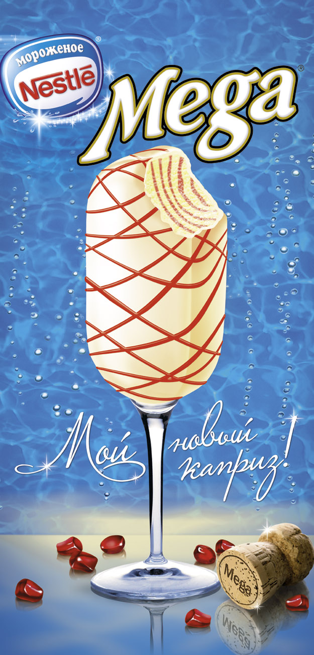 А не выпить ли нам шампанского?Рекламная кампания мороженого MegaАгентство Publicis United разработало креатив для рекламной кампании мороженого Mega (выпускается Nestle). Макеты размещаются на пилларах и в сити-формате. Агентство работает с этим брендом довольно давно. Пожалуй, наиболее яркой наружкой «Меги» была кампания «Хочу и всё!». Она вышла в 2007 году и вызвала довольно неоднозначную реакцию общественности. Состав творческой группы Publicis United |