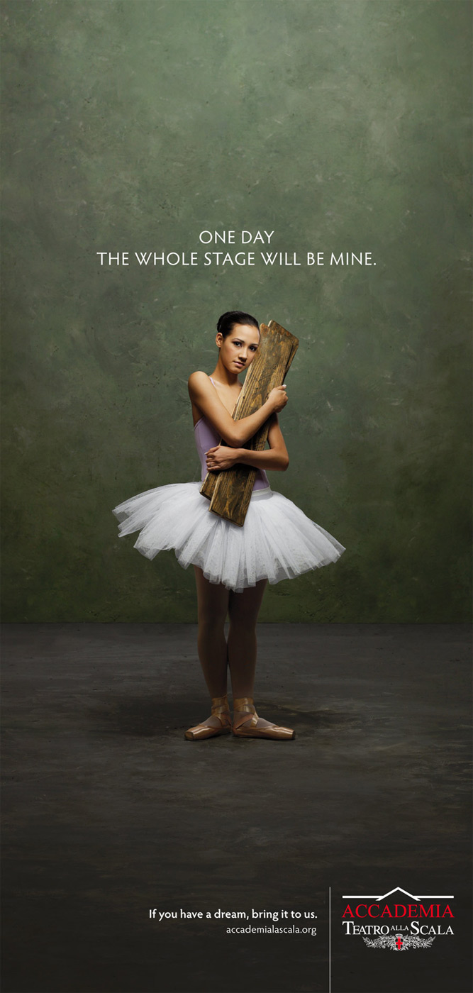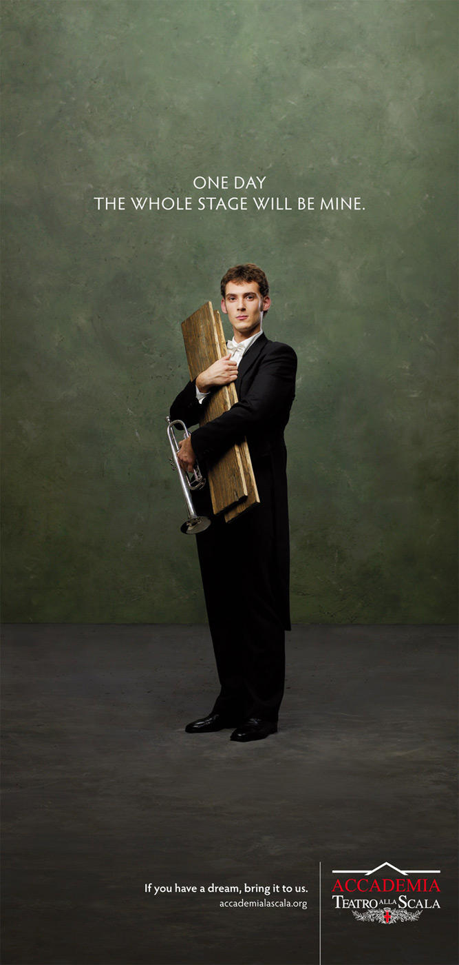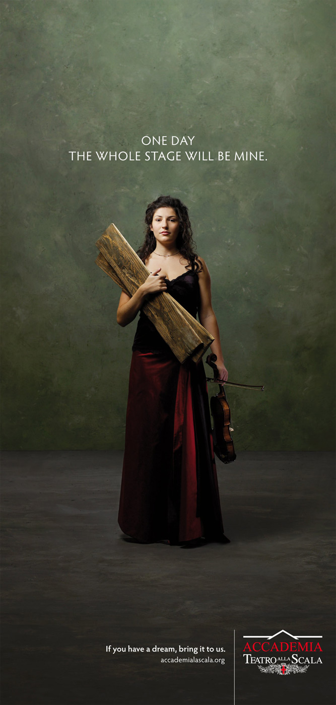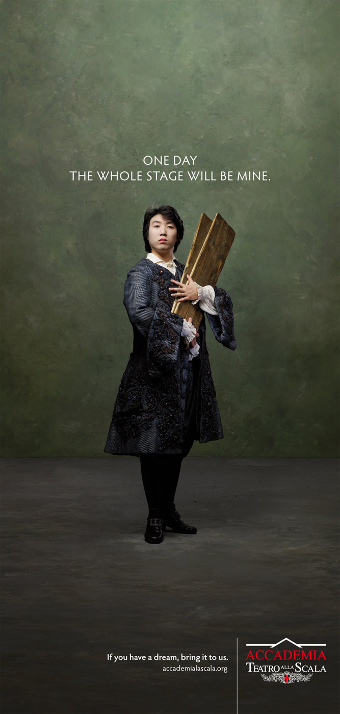 Реализация мечты в Accademia Teatro alla ScalaAccademia Teatro alla Scala была основана в 2001 году и сейчас уже является настоящим университетом искусств. Разделенная на четыре факультета - Музыка, Танец, Сцена и Менеджмент - академия каждый год выпускает из своих стен более 400 талантливых молодых людей и может с полным правом считаться уникальной в Европе.Студенты учатся здесь бок о бок с именитыми артистами и работниками сцены, набираются опыта при непосредственном погружении в среду и получают наилучшее на этом поприще образование. Accademia Teatro alla Scala всегда готова помочь реализовать мечту. Слоган: "Когда-нибудь вся сцена будет моей. Если у тебя есть мечта, расскажи нам о ней" Advertising Agency: Tita, Milano, Italy Art Director: Emanuele Basso Copywriter: Giuseppe Mazza Photographer: Reed Young Producer: Sonia Rocchi Scenographer/Stylist: Miren Mara?on |