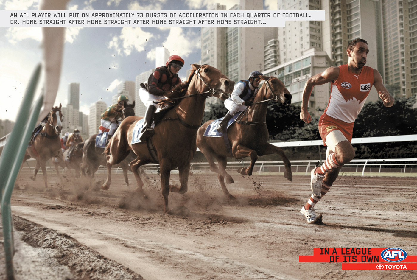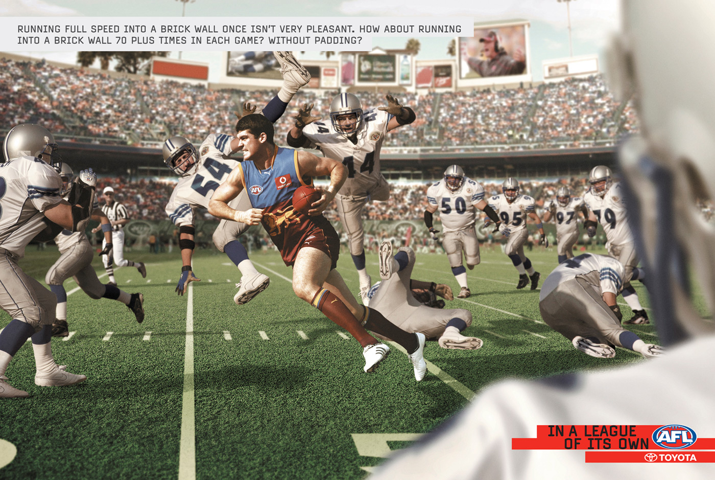 Трус не играет в футболНикто и никогда не будет спорить, что спорт несомненно очень важен. И при обилии рекламы на современном рынке спорт тоже нужно рекламировать. Чем и занимается австралийское агентство George Patterson Y&R. Недавно была запущена рекламная кампания Австралийской Футбольной Лиги. Хотя австралийский футбол (а именно в него играют в этой лиге) стал самостоятельным видом спорта только в конце XIX века, он уже успел завоевать множество поклонников по всему миру. На своих новых рекламных плакатах AFL демонстрирует насколько непростая это игра, и хочет показать, что от этого она становится еще интересней.Слоганы: Игроку AFL нужны молниеносные рефлексы, умение двигаться в любом направлении и глаза на затылке. Такая лига. Игрок пробежит 12.18 километров со скоростью в 7.33 километра в час, у него останется около 90 минут для пересечения игрового поля. Такая лига. Игрок AFL выдаст ускорение около 73 метров в секунду в каждом тайме. Ну?или хоум стрейт за хоум стрейтом за хоум стрейтом... Такая лига. Врезаться в кирпичную стену на полной скорости не очень приятно. Как на счет врезаться в нее больше 70 раз каждую игру? Без защиты? Такая лига. Advertising Agency: George Patterson Y&R, Melbourne, Australia Creative Director: Ben Coulsen Art Director: Frank Muller Copywriter: Katie Britton Photographer: Christopher Tovo (christophertovo.com) Retouching: Malcolm Stark |