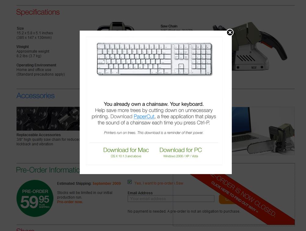 Первая в мире usb-мотопила i.SawВеликолепное промо от компании PaperCutНа прошлой неделе в сети распространилась информация о создании уникального гаджета - первой в мире usb-мотопилы под названием i.Saw. Как и у любой технической новинки у i.Saw имеется свой сайт, на котором можно посмотреть рекламный ролик, ознакомиться с техническими характеристиками и даже сделать предзаказ. Стоимость usb-мотопилы размером с клавиатуру составила всего 60 долларов. Правда или розыгрыш? Западные пользователи Интернета сразу же начали спорить в своих блогах на этот счет, но страсти не успели сильно накалиться - уже через несколько дней истина была открыта всем. Тем, кто все-таки решился заказать это техническое чудо, пришло письмо следующего содержания: "Привет. Нам приятно, что вам так понравилась i.Saw, что вы решились на предварительный заказ. Но на самом деле у вас уже есть своя мотопила. Ваша клавиатура. Помогите спасти больше деревьев от вырубки из-за ненужных распечаток. Скачайте PaperCut - бесплатное приложение, которое будет издавать звук мотопилы каждый раз, когда вы нажимаете Cntrl-P (команда на печать документа - прим. ред.). Доступно для Mac и PC. Спасибо за поддержку. Помогите распространить слух, если захотите :) PaperCut Team (Ранее известны как i.Saw Team)". Все-таки розыгрыш, но зато какой! Когда все стало известно, раздел предзаказа на сайте i.Saw был закрыт - вместо формы для заполнения появлялось сообщение, похожее на то, что рассылалось в письмах. Кроме того, на сайте PaperCut появился раздел, где интерактивный принтер распечатывает то же сообщение, и предлагается скачать бесплатное приложение, о котором шла речь выше. Таким образом компания решила напомнить всем, что бумага сделана из деревьев и распечатки ненужных документов ничем не отличаются от бессмысленной порубки леса. Торговая марка PaperCut представлена на рынке уже несколько лет, под ней выпускаются офисные программные продукты для контроля и квотирования использования Интернета и печати. Как утверждается на сайте, на сегодняшний день эти программы используются в 60 странах 20 тысячами компаний. Не стоит сомневаться, что их беспрецедентный промо ход с usb-мотопилой запомнится надолго. И не в последнюю очередь потому, что многие пользователи действительно захотели купить пилу i.Saw. Глеб Кузнецов, Sostav.ru |