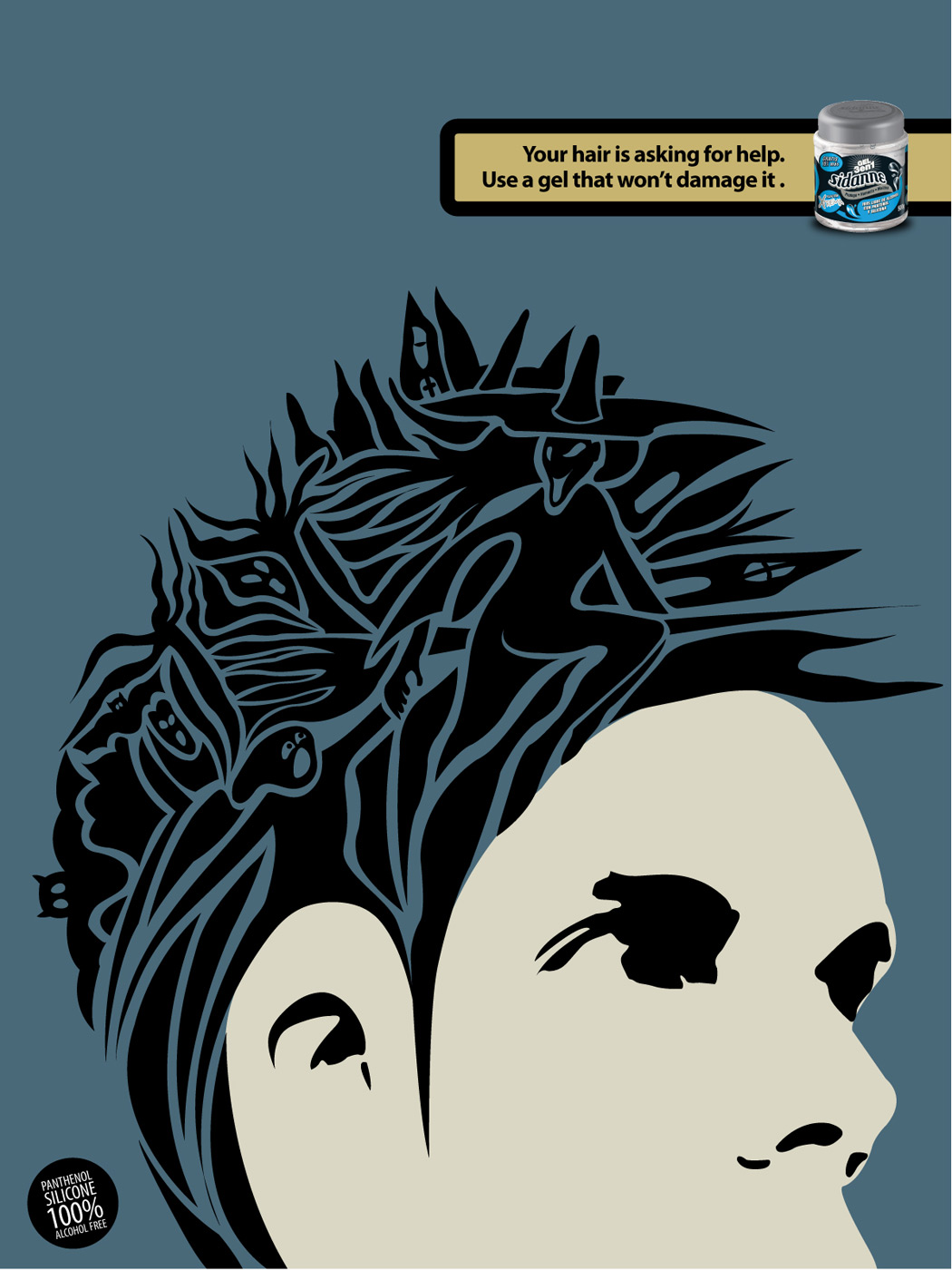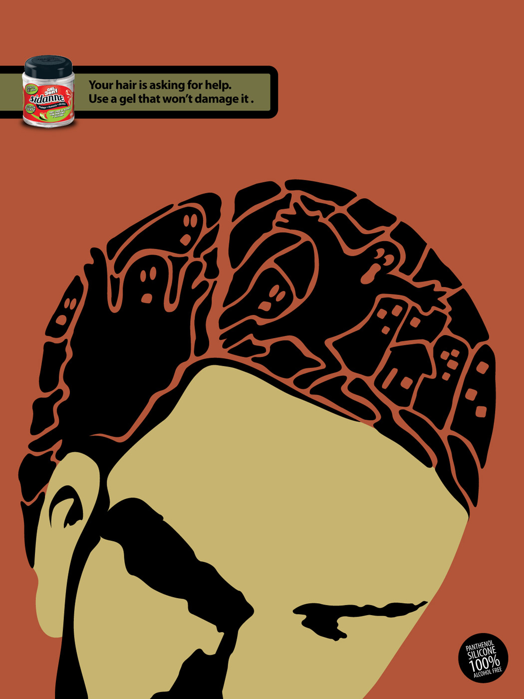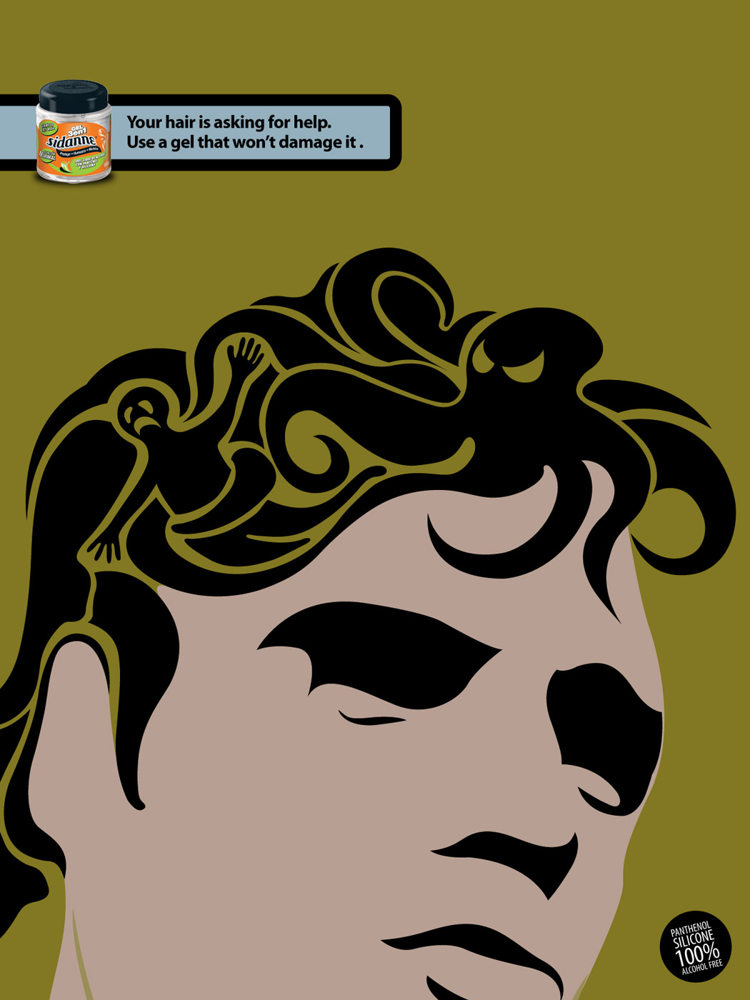 Никакого алкоголяВолосам всегда требуется уход, и в этом несомненно поможет новый гель от компании Sidanne. На сколько бы пугающим не было то, что поселилось в шевелюре клиента, это средство обязательно поможет, заявляют рекламные принты эквадорского агентства Punto 99. Еще бы, ведь это 100% силикон с пантенолом и абсолютно никакого содержания алкоголя!Слоган: "Ваши волосы просят о помощи. Используйте гель для волос, который не повредит им." Advertising Agency: Punto 99, Quito, Ecuador Creative Directors: Javier Reyes, Luis Franco Art Director: Wilson Castro |