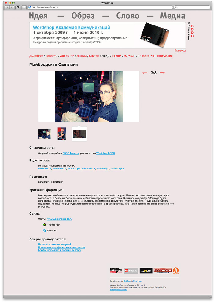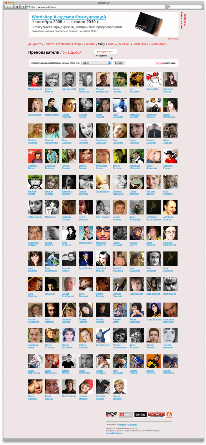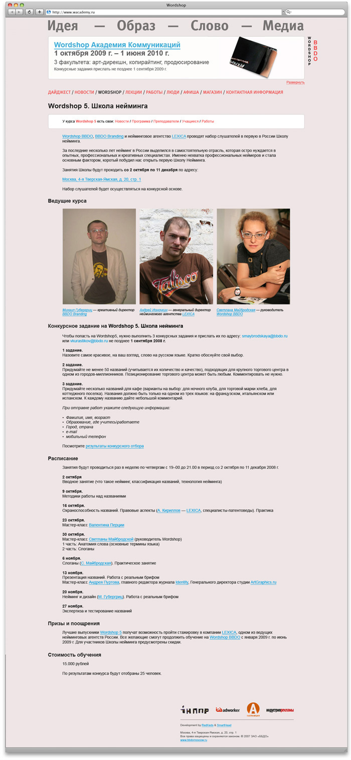 Сайт Wordshop BBDO от Red KedsАкадемия Коммуникаций обзавелась полноценным вэб-представительствомКреативное агентство Red Keds совместно с компанией SmartHead разработали сайт www.wacademy.ru для школы зубастых рекламистов Wordshop BBDO, которая недавно переросла в Академию Коммуникаций. Перед разработчиками стояла непростая задача: создать информационный ресурс, который освещал бы все сферы деятельности Wordshop BBDO и имел бы гибкую структуру. Сайт создан по принципу конструктора: он состоит из различных потоков, и у посетителя есть возможность сортировать их так, как ему удобно. Модульная структура, лаконичный дизайн, удобная навигация - основные принципы, опираясь на которые стало возможным создать простой, удобный и информативный сайт. Светлана Майбродская, руководитель школы Wordshop BBDO, комментирует работу Red Keds: "Мы очень довольны нашим новым сайтом. Предыдущий сайт помог Wordshop как рекламной школе вырасти и встать на ноги. Новый сайт отражает идею Wordshop как сообщества людей, которые постоянно развиваются и стремятся совершенствовать себя и мир. У нас с каждым днём появляется всё больше и больше интересного контента, которым хочется поделиться, и всё больше и больше людей собирается вокруг проекта, которым этот контент нужен. Надеюсь, что новый сайт будет территорией для такого виртуального общения и обмена информацией". Состав творческой группы: Руководитель проекта: Олег Зильберг, Виталий Быков Креативный директор: Олег Зильберг, Виталий Быков Арт-директор и дизайнер: Стас Поляков Программирование: компания SmartHead |