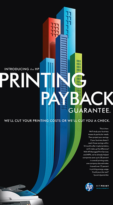 Hewlett-Packard Сo. на этой неделе запустила новую рекламную кампанию под названием "Благоразумие в печати" ("Hit Print Intelligently"). Кампания была разработана Goodby Silverstein & Partners (Omnicom Group). Она проходит под лозунгом "Мы урежем вами расходы на печать или выпишем вам чек" ("We'll cut your printing costs or we'll cut you a check") и включает онлайн-баннеры, микросайты, печатную рекламу в основных американских изданиях.