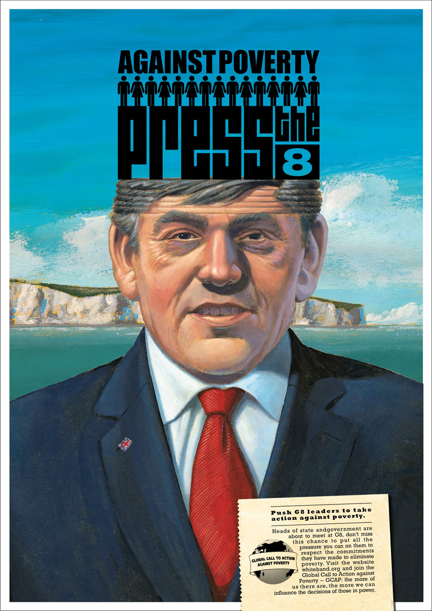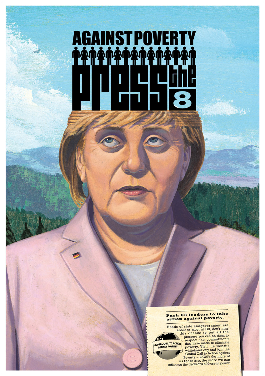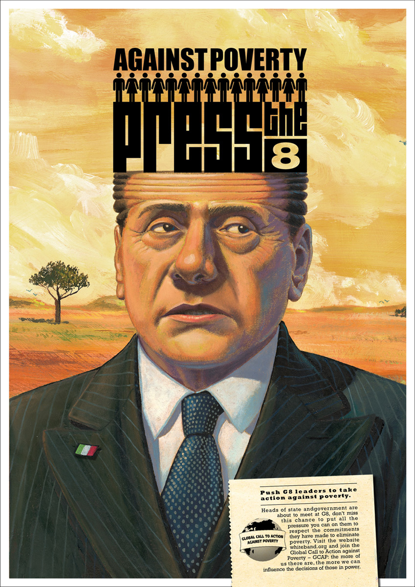 Борьба с бедностью по всему мируGlobal Call to Action Against Poverty - растущий международный союз, состоящий из национальных коалиций и проводящий различные кампании, направленные на борьбу с бедностью. Уже более 40 миллионов людей в 90 странах по всему миру стали участниками GCAP. "Наша группа чрезвычайно разнообразна и все мы непохожи друг на друга, но мы прекрасно понимаем, что достигнем гораздо большего, если будем работать все вместе," - говорят представители союза. Главными целями GCAP являются такие задачи как всеобщее признание равенства полов, помощь в борьбе за права детей, молодежи, женщин и других ущемляемых групп. И конечно же, повсеместная борьба с бедностью в любых ее проявлениях.Слоган: "Для борьбы с бедностью нажмите 8. Подтолкните лидеров "Большой Восьмерки" к принятию мер против бедности." Advertising Agency: Grey Milan, Italy Creative Director: Francesco Emiliani Head of Art: Francesco Fallisi Art Director: Letizia Bozzolini Copywriter: Francesca Andriani Illustrator: Paolo Rui Art Buyer: Virginia Salvucci Account Supervisor: Emanuela Carnaghi |