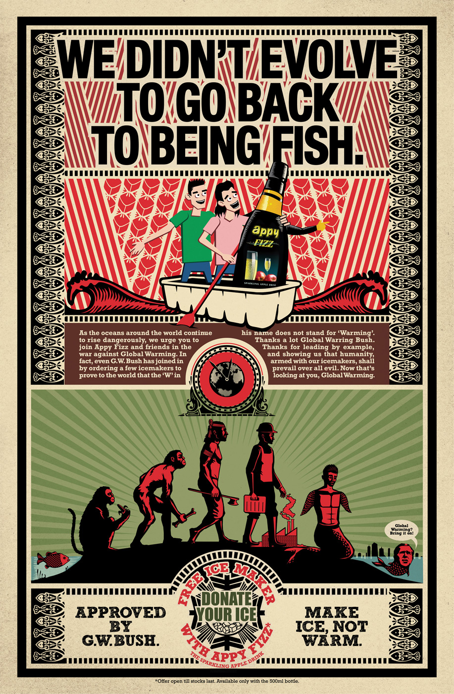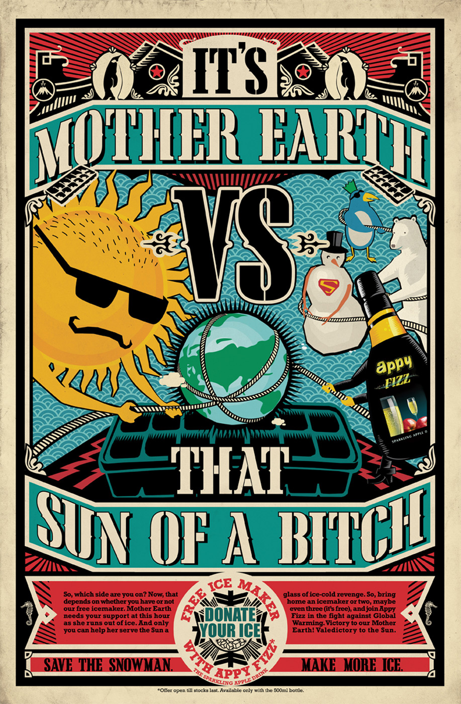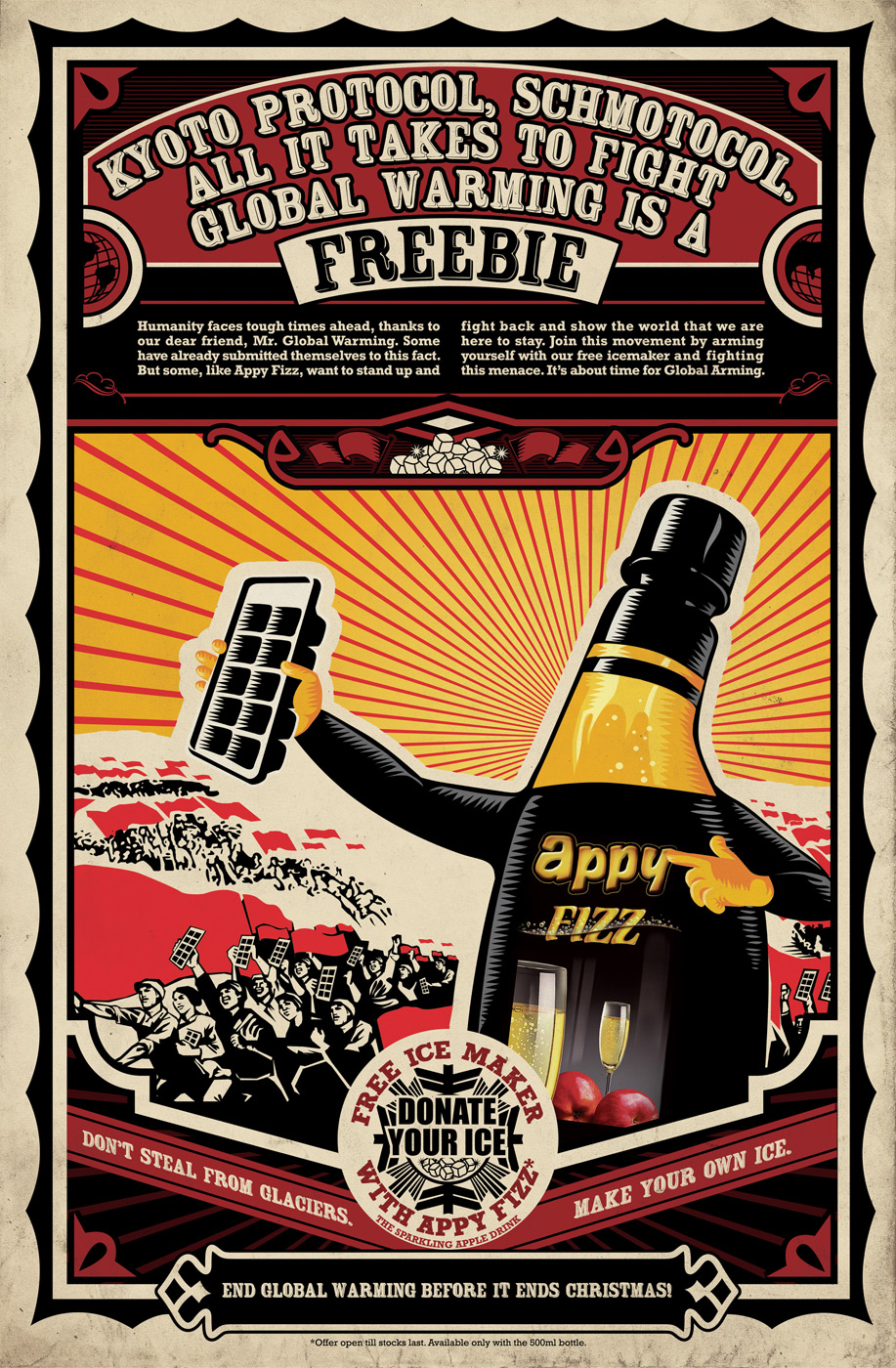 Больше льда с Appy FizzAppy Fizz - напиток на основе газированного яблочного сока. Он был впервые представлен индийской компанией Parle в 2005 году, после успешной презентации на рынке его предшественника Appy. В основном Appy Fizz используется как основа для алкогольных и реже безалкогольных коктейлей. Недавно была запущена новая кампания от агентства Creativeland Asia. На веселых рекламных принтах потребителя просят и делать больше льда, и спасти снежных людей, и даже остановить глобальное потепление.Advertising Agency: Creativeland Asia, Mumbai, India Executive Creative Directors: Sajan Raj Kurup, Vikram Gaikwad Creative Directors: Anu Joseph Copywriters: R.Venkatraman, Huzefa Kapadia, Sajan Raj Kurup Art Director: Payal Juthani Illustrator: Lokesh Karekar Account Supervisor: Jay Gala |