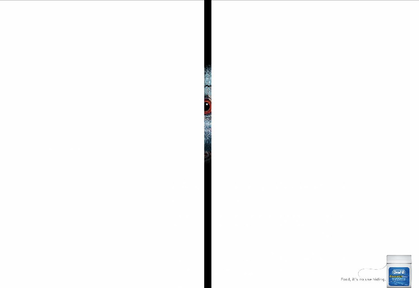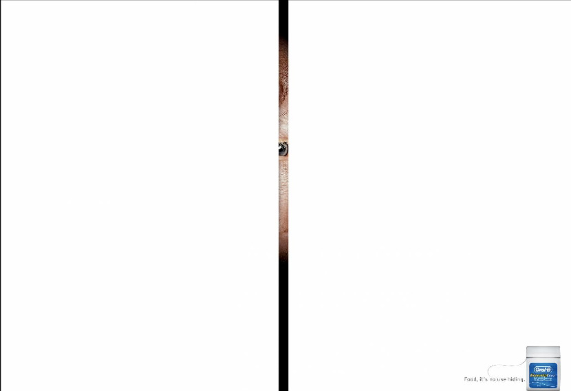 Зубные нити Oral-B для ежедневного ухода за полостью ртаКомпания Oral-B является мировым лидером на рынке зубных щеток и других продуктов для ухода за полостью рта. Ведь полноценный ежедневный уход за полостью рта - это больше, чем просто чистка зубов. Даже при тщательной чистке невозможно полностью удалить налет из всех промежутков между зубами, поэтому компанией Oral-B была разработана зубная нить Dental Floss. Чистка зубной нитью позволяет бороться с заболеваниями десен, кариесом и помогает сохранять зубы здоровыми. Польза зубных нитей компании доказана клинически.Слоган: "Еда, тебе не спрятаться." Advertising Agency: Publicis Brasil Sao Paulo, Brazil Chief Creative Officer / Executive Creative Director: Hugo Rodrigues Creative Directors: Hugo Rodrigues, Tony Goes Copywriter: Rodrigo Strozenberg Advertiser's Supervisor: Andres Lefebvre Account Manager / Account Supervisor: Karin Kimura Art Buyer: Selma Momosse Art Director: Fabio Onofre Illustrator: Gelmi Photographer: Pedro Dimitrow/Gelmi |