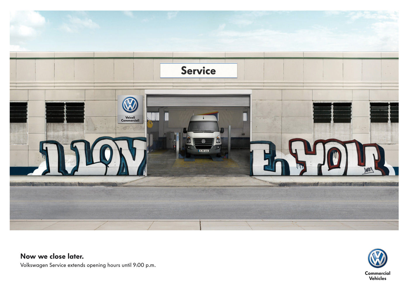 Volkswagen Service будет работать дольшеВ современных условиях жесточайшей конкуренции на мировом авторынке на одних инновациях далеко не уедешь. Поэтому многие известные компании открывают всевозможнейшие станции обслуживания и тому подобные заведения. "Стоимость автомобиля и безопасноcть движения на нем зависят от его обслуживания и регулярного ухода за ним. Обычный уход или профессионально выполненный ремонт - советы наших специалистов помогут вам поддерживать свои машины в отличном состоянии в течение многих лет." - говорят представители Volkswagen. Volkswagen Service были открыты уже очень давно, всегда выручали владельцев машин компании. А стартовавшая недавно рекламная кампания Volkswagen Service от итальянского агентства DDB зазывает новых клиентов, обещая им закрывать двери позже.Слоган: "Теперь мы закрываемся позже. Volkswagen Service работает до 21:00." Advertising Agency: DDB, Milan, Italy Creative Director: Vicky Gitto Art Director: Mattia Montanari Copywriter: Riccardo Ciunci Post-Production: Mattia Montanari |