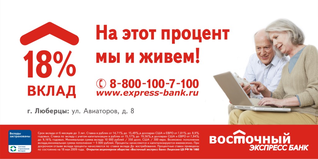 Прибавка к пенсииАгентством "Железный" проведена рекламная кампания Восточного Экспресс БанкаВ июне-июле состоялась рекламная кампания депозитов Восточного Экспресс Банка. Размещение на поверхностях 3х6 было проведено агентством "Железный". Кампания была нацелена на жителей пяти подмосковных городов: Серпухов, Люберцы, Электросталь, Электрогорск, Сергиев Посад. |