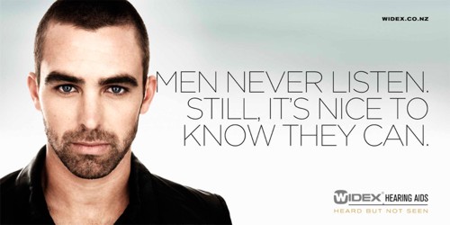 Слышать лучше все, считает WidexКомпания Widex - один из ведущих мировых производителей цифровых слуховых аппаратов. Продукция компании продается более чем в 90 странах мира, а ее доля в мировом производстве слуховых аппаратов составляет около10%. По своим показателям Widex занимает шестое место в списке крупнейших производителей слуховых аппаратов на мировом рынке.Недавно вышла в свет очень неоднозначная рекламная кампания Widex от ново-зеландского агенства Barnes, Catmur & Friends. Яркие принты и циничные слоганы привлекут внимание любого клиента. Слоганы: "Мужчины никогда не слушают. Все равно приятно знать, что они могут." "Не слышать ничего плохого было бы немного неудобно" "Если о тебе будут говорить, хорошо было бы слышать что" Advertising Agency: Barnes, Catmur & Friends Auckland, New Zealand Photographer: Craig Owen |