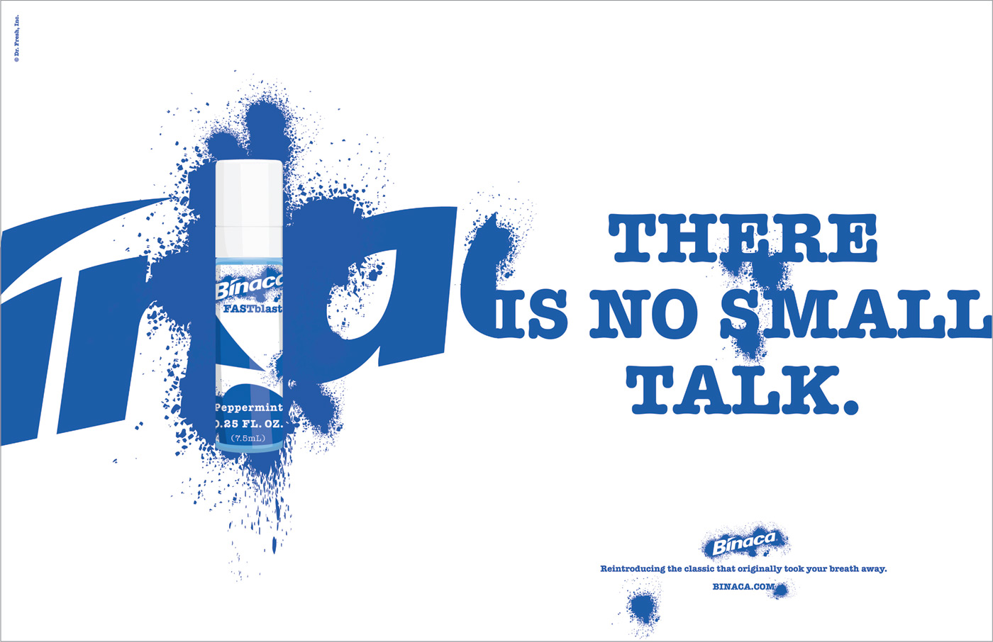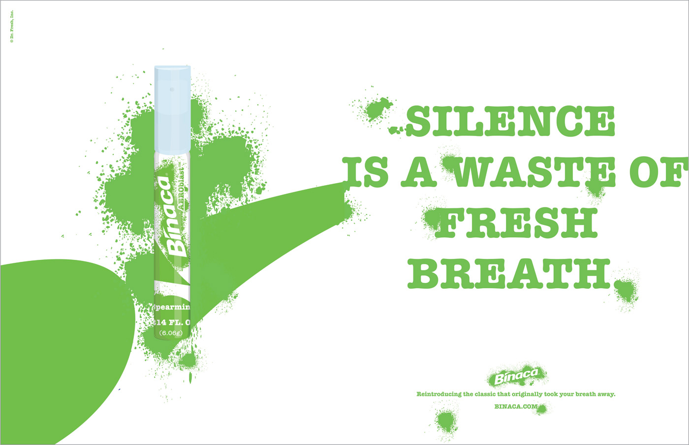 Binaca возвращается на рынок глотком свежего воздухаАмериканская компания Binaca, являющаяся дочерним брендом корпорации Dr. Fresh, более 75 лет продавала по всему миру свои спреи для рта, помогающие устранять неприятные запахи и сохранить свежее дыхание. Но вот последние несколько лет этого названия не слышно. "Нет, мы не пропали," - успокаивают своих клиентов разработчики спреев в своей новой рекламной кампании от агентства GERTRUDE из Чикаго. Binaca возвращается на рынок с тремя новыми продуктами, чему и посвещена новая кампания, стартовавшая в июне.Слоган: "Снова представляем классику, от которой вы всегда теряли дыхание." Advertising Agency: GERTRUDE, Chicago, USA Chief Creative Officer: Otis D. Gibson Art Directors: Otis D. Gibson, Zina Simonaitis, Sarah Stickles Copywriter: Kevin Orsini |