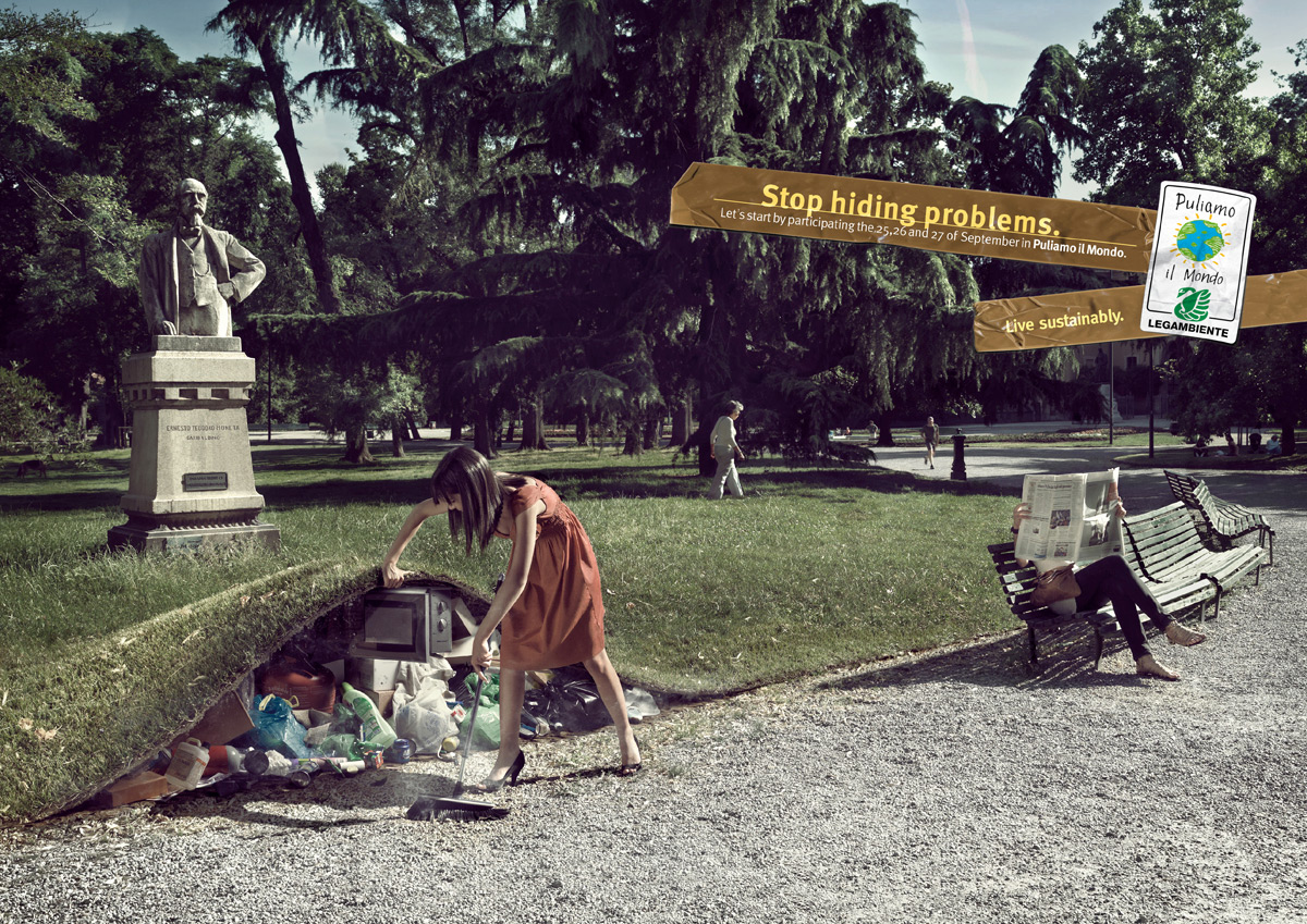 Legambiente очистит мирLegambiente можно смело назвать "итальянским гринписом". Это мощнейшая в стране экологическая организация с двадцатью региональными отделениями, тысячей местных клубов и более 110 тысяч членов. Каждый год Legambiente проводят общеитальянские экологические акции, самой крупной из которых бесспорно является Puliamo il Mondo или "очистим мир". И уже не первый год пиаром этой акции занимается миланское рекламное агентство Forchets. Их рекламные принты всегда были дерзкими, неоднозначными и привлекающими внимание - как в прошлом году, так и в этом.Слоган: "Хватит прятать проблемы. Начнем решать их, приняв участие в акции "Очистим Мир" 25, 26 и 27 сентября. Живи всегда." Advertising Agency: Forchets, Milan, Italy Executive Creative Director: Niccol? Brioschi Creative Director Copy: Francesco Montella Art Director: Livio Grossi Copywriter: Hilija Russo Photographer: Zona 13 |