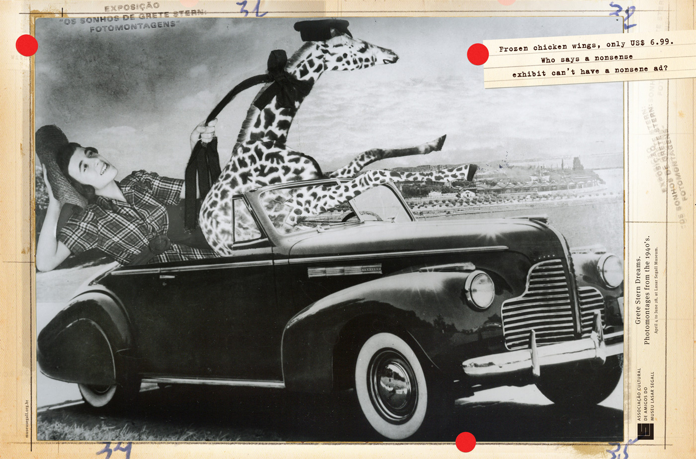 Лазарь Сегал приглашает назад в прошлоеВ 1967 году дом бразильского живописца, графика и скульптора Лазаря Сегала был превращен его детьми в высокоавторитетные в Сан-Паулу музей, некоммерческий культурный центр и художественную школу. А каждая новая выставка в любом музее требует анонса.Так и в этот раз, рекламное агентство Ogilvy создает кампанию для выставки фотографий Греты Штерн. Бразильские креативщики идут по уже проторенному пути - подобные приемы с использованием разных дерзких фраз вкупе с постоянным слоганом для них давным давно уже не внове. Слоганы: "Реалистичное описание 40-ых, когда жирафы следили за дорогой, а черепахи умно одевались. Мечты Греты Штерн. Фотоколлажи 1940-ых. Все это в Музее Лазаря Сегала." "Замороженые куриные крылышки всего по $6,99. Кто сказал, что у выставки ерунды не может быть ерундовой рекламы? Мечты Греты Штерн. Фотоколлажи 1940-ых. Все это в Музее Лазаря Сегала." "Манипуляции с женщинами и фотографией. С одним только маленьким отличием - женщины были одеты. Мечты Греты Штерн. Фотоколлажи 1940-ых. Все это в Музее Лазаря Сегала." Advertising Agency: Ogilvy, S?o Paulo, Brazil Creative Directors: Anselmo Ramos, Rubens Filho Art Directors: Denis Kakazu, Daniel Scheiner Copywriter: Hugo Catraio Photographer: Grete Stern |