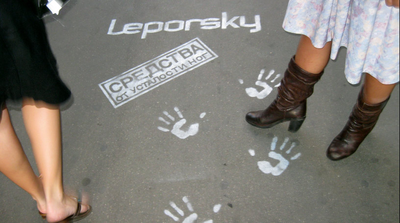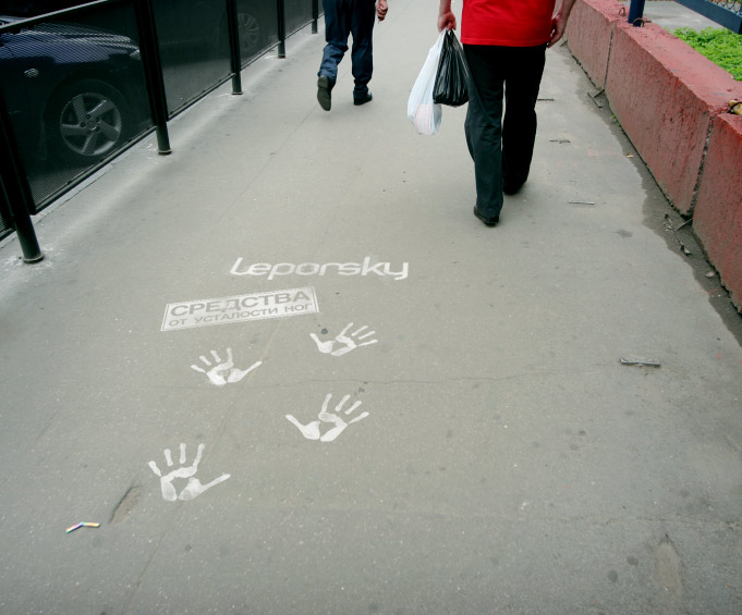 Магазин мужской косметики Leporsky Esthetique восстал против традиционной рекламыИнтернет-магазин косметики Leporsky Esthetique решил использовать возможности нетрадиционных рекламных носителей и освоить городское пространство. Для донесения информации о средствах по уходу за ногами и кремов от загара были задействованы асфальтовые мостовые, стены и бетонные заборы, на которые были нанесены отпечатки краской. Одна из проблем городского человека, живущего активной жизнью, это усталость ног. Это обстоятельство было обыграно с помощью простых графических средств — следов от рук на асфальте и надписи, рекламирующей средства от усталости ног, продающиеся в магазине Leporsky Esthetique. Точно так же, с помощью изображения женского силуэта на стене, были поданы средства от загара. Онлайновые сервисы традиционно рекламируют себя по месту прописки, то есть непосредственно в Интернете. До сих пор интернет-магазины ограничивались в своей рекламе более привычной для них окружающей средой, рассчитывая на внимание потенциальных клиентов, которые проводят время за компьютером. Решив, что он-лайн и офф-лайн-среда, в современном мире все больше становятся единым пространством, Leprosky Esthetique решил выйти на улицу. Рекламная акция, прежде всего, направлена на привлечение внимания к бренду. ![]() |