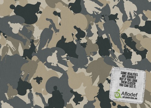 "Обратите внимание..." - просит AflodefБразильское рекламное агентство Marcca Comunicacao создало новую серию социальной рекламы для общественной организации Aflodef. Слоганы с принтов пытаются привлечь всеобщее внимание к тем фактам, которые все видят ежедневно, но зачастую оставляют без какой либо реакции. Казалось бы, на принтах этих изображен обычный камуфляж... Однако если присмотреться, можно увидеть гораздо больше, нежели простые пятна.Слоганы: "Хуже не быть воспринятыми, а не не быть замечеными." "Просто признайте неполноценность прав тех, кто пытается диктовать их обществу." "Некоторые факты игнорируются, но если вы посмотрите на них поближе, вы все увидите." Advertising Agency: Marcca Comunicacao, Florianapolis, Brazil Creative Director: Alemao Rodrigues Art Director: Marcello Storino Copywriter: Joao Claudio Lins Illustrator: Marcello Storino Retouching: Kado Digital Art |