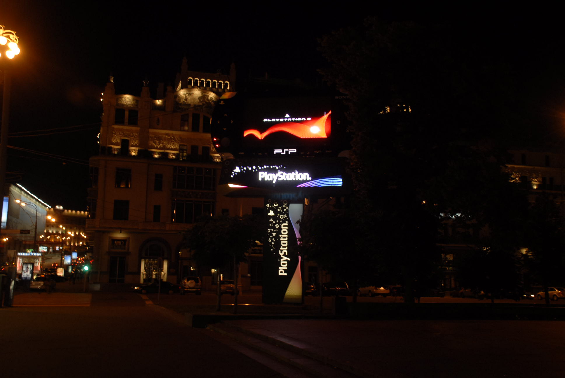 Нестандартная конструкция в форме консоли Брендированный под PSP экран транслирует ролики, промотирующие саму консоль, таким образом в некотором смысле объединяя в себе три канала коммуникации: наружную рекламу, плазменные панели и телеролики.