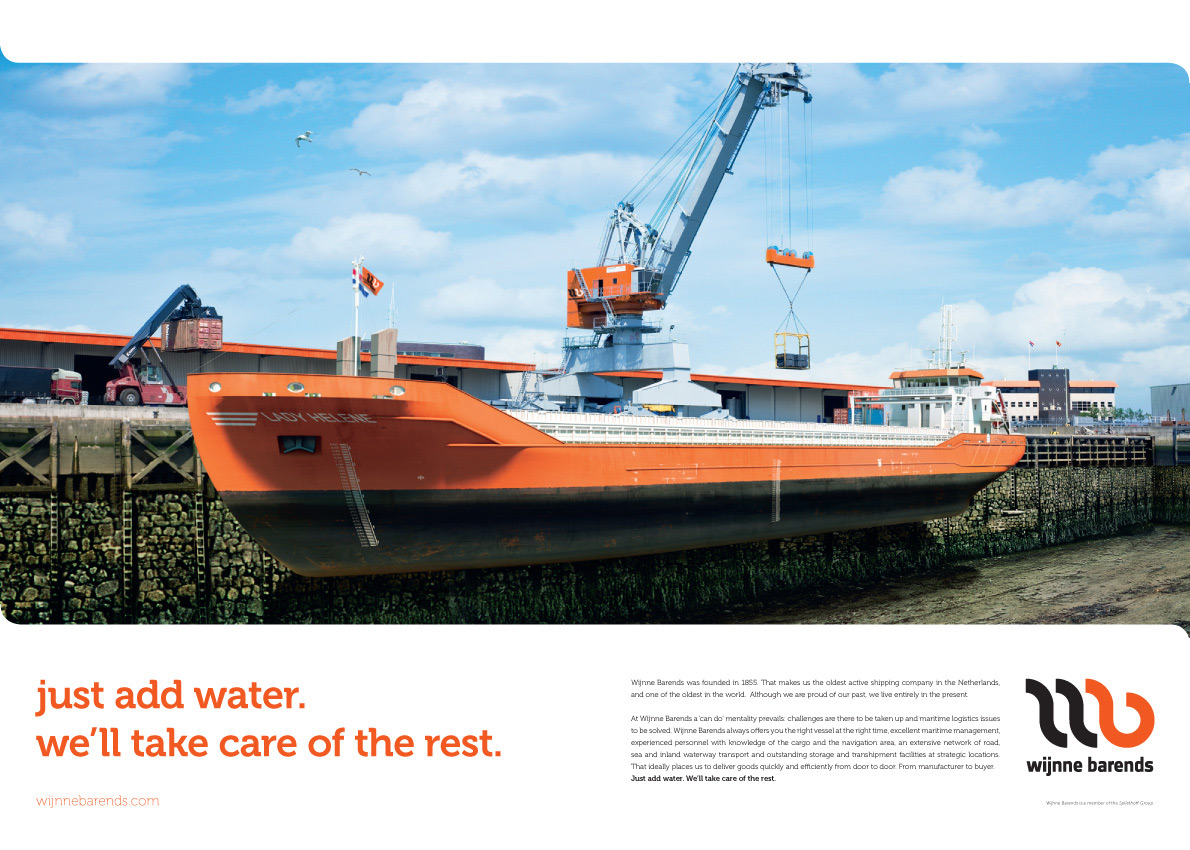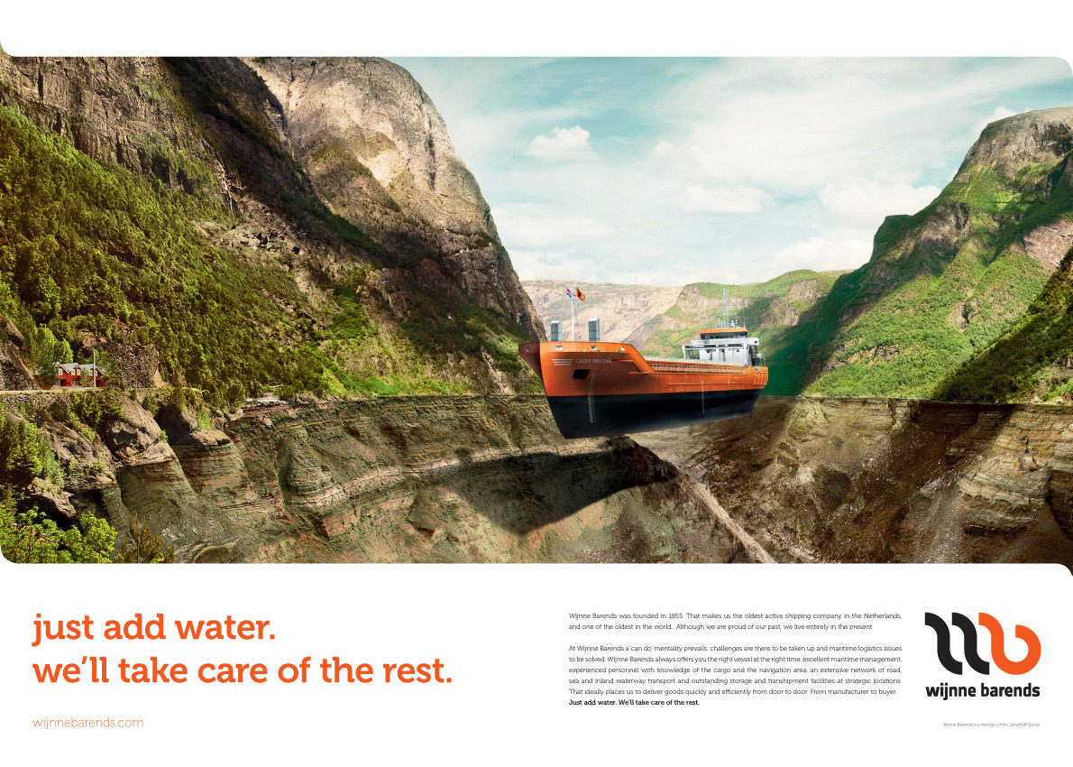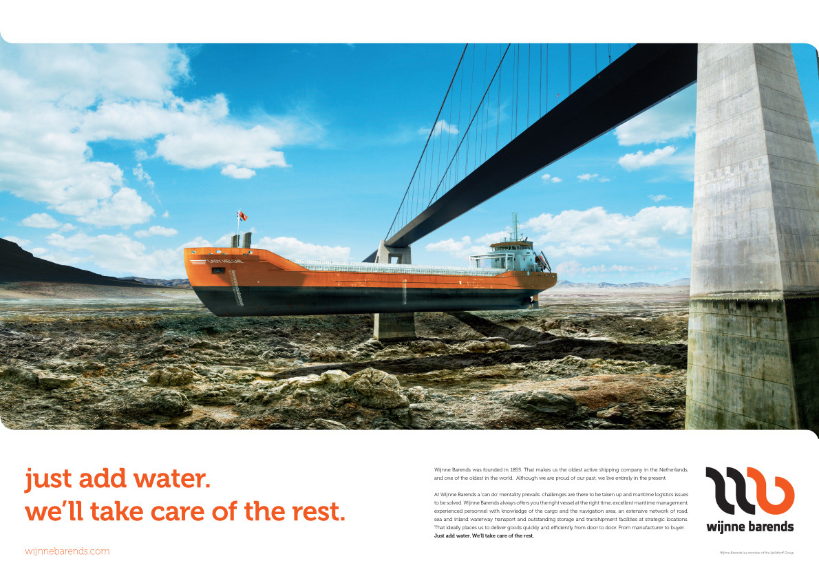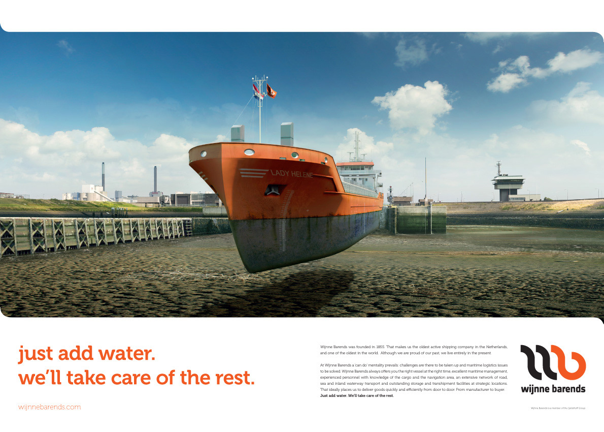Wijnne Barends - просто добавь водыТранспортная судоходная компания Wijnne Barends уже не первый год базируется в Нидерландах и 24 часа в сутки круглый год предлагает свои услуги каждому. На этой идее и основана новая рекламная кампания фирмы. На принтах, созданных гронингенским креативным агентством Dizain судна Wijnne Barends просто висят в воздухе в местах, где вроде как должна была бы быть вода. Вот ее-то и надо добавить. Ее и только ее. А уж все остальное сделают сами Wijnne Barends - именно так утверждает кампания.Слоган: Просто добавьте воды. А мы уж позаботимся обо всем остальном. Advertising Agency: Dizain, Groningen. The Netherlands Creative Director: Roel Tiemessen Art Director: Roel Tiemessen Copywriter: Erik Meijerink Illustrator: INDG Photographer: INDG/Peter Tahl |