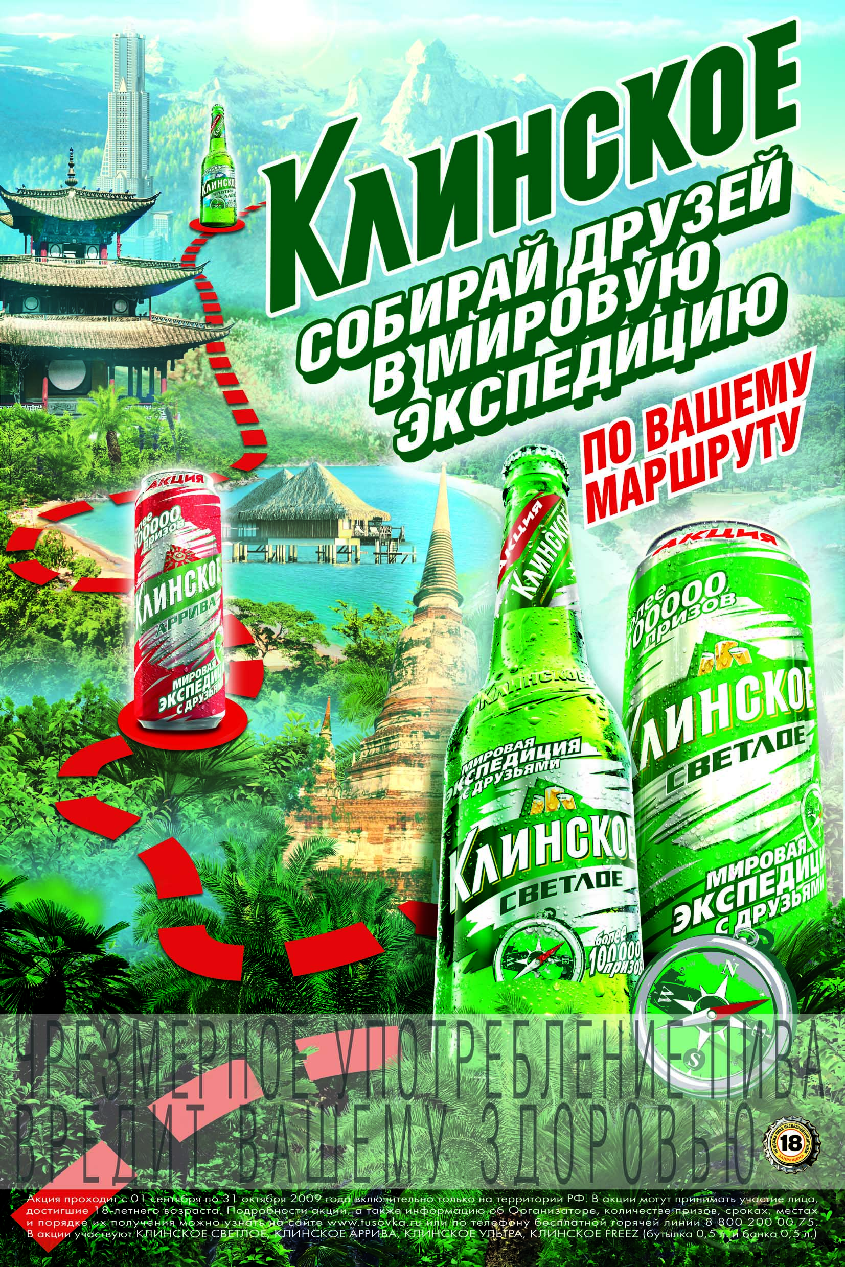 Мировая экспедиция вместе с "Клинским""САН ИнБев" запускает национальную промо-акцию "Клинского" "Мировая экспедиция с друзьями"С 1 сентября потребители всей продуктовой линейки "Клинского" во всех регионах России могут выиграть поездку для компании друзей из пяти человек по их собственному маршруту - через любые города, на любом виде транспорта, в любой город мира. Основной инструмент акции -интернет сайт www.tusovka.ru. Участники акции могут проложить по его иллюстрированной виртуальной карте маршрут желаемого путешествия с друзьями, который по итогам 3 недель может стать их настоящим приключением-экспедицией. Дальность поездки и шансы на победу определяется количеством уникальных кодов с бутылок и банок "Клинского", зарегистрированных каждым участником. Помимо путешествия участники акции могут выиграть беспрецедентное количество призов: 450 билетов в любой город России, 20 000 удобных складных мангалов в практичной фирменной сумке от "Клинского", 80 000 зачислений по 100 рублей на мобильный телефон. В анонсе кампании задействованы все каналы коммуникации. Одновременно с запуском захватывающего телевизионного ролика, созданного в стиле фантастических боевиков, в 23 крупнейших городах стартует масштабная кампания в наружной рекламе, которая поддерживается рекламой на местах продаж, а также креативным оформлением выкладки продукта в крупных торговых сетях. |