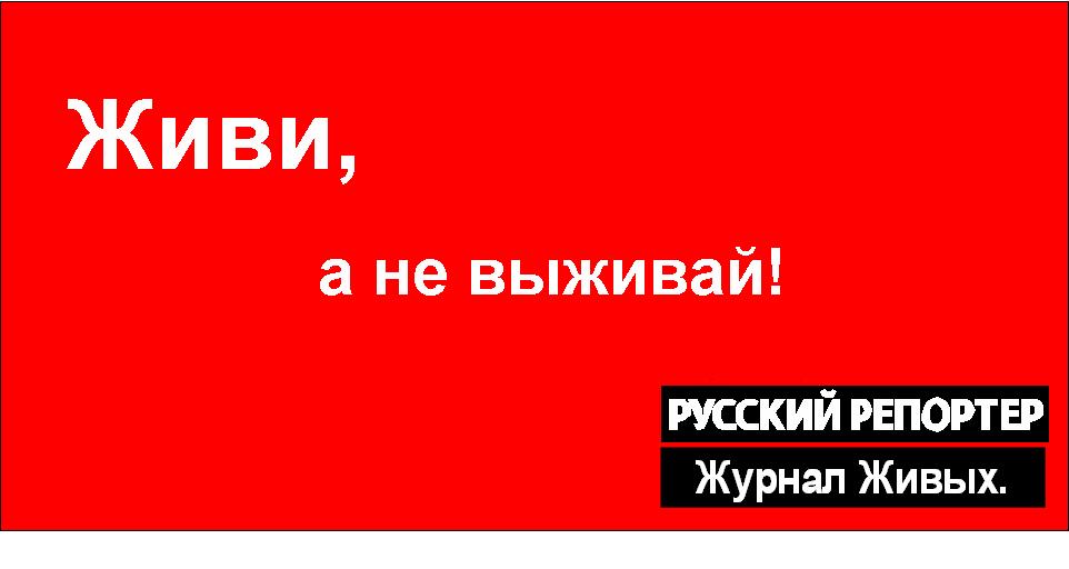 "Журнал живых": живи и жуйКампания "Русского репортера"Журнал "Русский Репортер", входящий в медиахолдинг "Эксперт", с 9 сентября начинает осеннюю рекламную кампанию под названием "Живи, а не выживай!" и слоганом "Журнал Живых". Концепция кампании сформулирована исходя из ожиданий читателей и рекламодателей и текущей кризисной ситуации. Цель кампании подчеркнуть, что "Русский Репортер" - это журнал для думающих, любящих, строящих, созидающих и творящих людей с активной жизненной позицией, которые готовы менять собственную жизнь и окружающий их мир. По словам директора по маркетингу медиахолдинга "Эксперт" Андрея Громковского "Русский Репортер - это не просто журнал, а образ жизни, мышления и понимания мира. Журнал ориентирован на людей, которые уже свободны от иллюзий прошлого и готовы сами создавать собственную реальность каждый день". Из медиа каналов в рекламной кампании задействованы крупнейшие радиостанции, интернет-сайты, наружные носители и рекламные поверхности в бизнес центрах. |