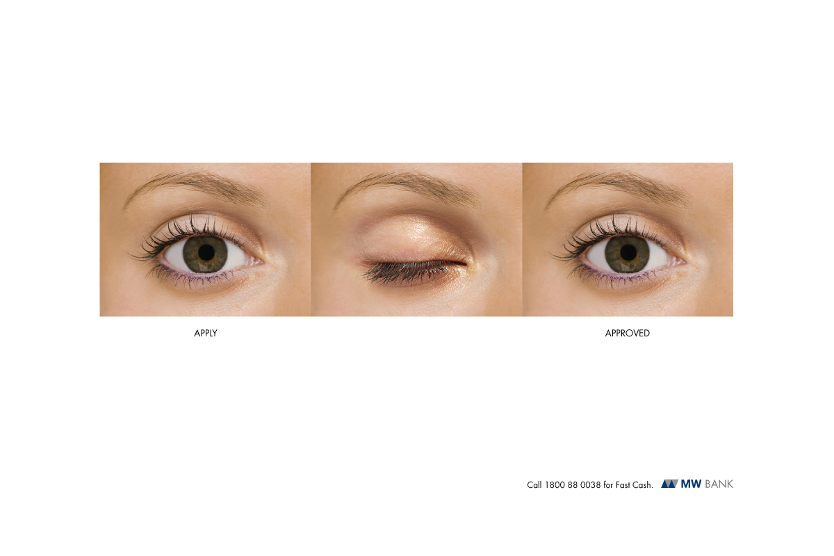 К вопросу о быстрых деньгахЧасто бывают в жизни такие ситуации, когда любой ценой нужны деньги. Срочно. А пока в банках рассмотрят ваше заявление о кредите, так уже и поздно будет. Все, больше таких проблем не будет, утверждает малазийское рекламное агентство Gimmix в последней кампании MW Bank.Вы успеете только один раз моргнуть за то время, что наш банк рассмотрит вашу заявку и даст подтверждение, - говорят принты. Кстати, эта кампания от Gimmix и вправду стала последней для MW Bank - с тех пор он был переименован в Securant Bank & Trust. Слоган: Звоните 1800 88 0038 для быстрых наличных. Advertising Agency: Gimmix, Malaysia Creative/Art Director: Ryan Yong Copywriter: Carrine Lim |