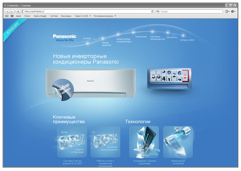 Сайт из водздухаErstMedia для PanasonicРекламное агентство ErstMedia разработало интерактивный сайт Vozduh.ru для кондиционеров Panasonic. Vozduh.ru - это не только промо-сайт, наглядно демонстрирующий с помощью flash-анимации ключевые особенности и технологии продукта, но и место взаимодействия с потребителями. На этой площадке планируется частое проведение различных акций для посетителей. Совсем недавно завершился конкурс среди пользователей на лучший совет, как и на чем можно сэкономить, где главным призом был кондиционер Panasonic. Графические потоки воздуха облегчат понимание основных принципов работы кондиционеров. Представленная информация о продукте поможет без труда найти для себя ответы на любые технические и практические вопросы, подобрать себе модель кондиционера по характеристикам помещения. Сайт олицетворяет собой рекламируемый продукт и органично отражает концепцию новой линейки сверхтонких кондиционеров Panasonic. |