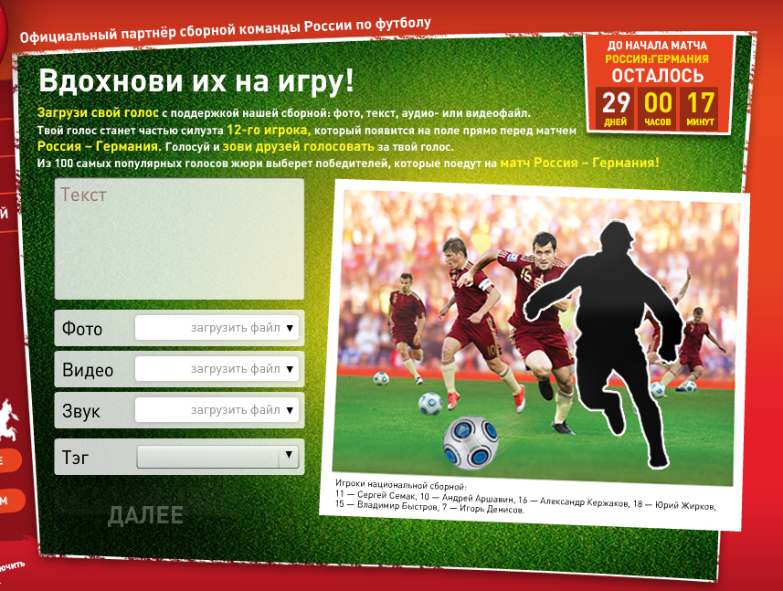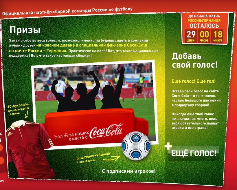 Coca-cola: голос для футболаCoca-Cola – официальный спонсор российской футбольной сборной. В этом году она выпустила на экраны логическое продолжение ролика «Береги голос», вышедшего в прошлом году в период проведения Чемпионата Европы. На этот раз герой готов смотреть матч по телевизору с бутылочкой колы. С экрана ему показывают прошлогодний ролик. Ролик «Береги голос», май 2008 года Рекламная кампания ведется в поддержку акции «Еще голос! Еще гол!», приуроченной к отборочному матчу на Чемпионат мира в ЮАР (2010). Матч состоится 10 октября. Адрес промосайта - http://1golos1gol.ru/ . Посетителям сайта предлагается принять участие в акции, загрузив файл с собственным голосом, свое фото, видео и текст. Как указано на сайте, все это станет частью силуэта, двенадцатого игрока, который появится на поле перед матчем Россия-Германия. Победителям вручат приглашения на диваны в специальной фан-зоне от компании «Кока-кола». Судя по всему, места будут расположены очень близко к футбольному полю.