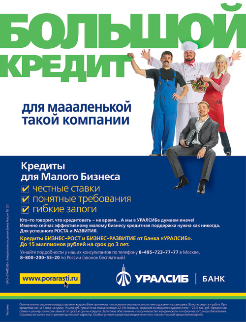 "Уралсиб": "Большой кредит для маленькой компании"Новая кампания банка от студии D2BАгентство Design To Business (Студия Александра Овчинникова) завершила работу над новой рекламной кампанией для Банка "УРАЛСИБ". С наступлением нового делового сезона Банк вновь заявляет о своей роли в кредитовании малого и среднего бизнеса. Креативное решение кампании - сочетание слогана "Большой кредит для маленькой компании" и знакомой каждому мелодии культовой песни творческого тандема Юнны Мориц и Сергея Никитина - как нельзя лучше настраивает на позитивный лад и создает благоприятный фон для подачи актуальной информации об условиях получения кредита. "Мы уверены, - говорит креативный директор агентства D2B Максим Березюк, - что те, кто помнит эту поучительную историю о дружбе и доверии, прочувствуют и еще один важный эмоциональный посыл: люди всегда смогут найти общий язык, если четко знают, чего хотят сами, и с уважением относятся к интересам других". Для размещения в СМИ силами D2B подготовлены печатные макеты и музыкальный радиоролик, в интернете будут размещены рекламные баннеры и обновленный промо-сайт www.porarasti.ru. Кампания стартует 15 сентября одновременно по всем каналам коммуникации и продлится до середины ноября. Состав творческой группы: Банк УРАЛСИБ: Исполнительный директор, Зам. руководителя Службы маркетинговых коммуникаций рекламы и связей с общественностью - Кирилл Масленников, Начальник Управления рекламы и корпоративных проектов - Павел Тарлинский, Руководитель Дирекции рекламных проектов - Анастасия Чинарева Студия D2B: Креативные директора - Максим Березюк, Александр Овчинников Арт-директор - Александр Плющев Эккаунт-директор - Марина Воронежская |