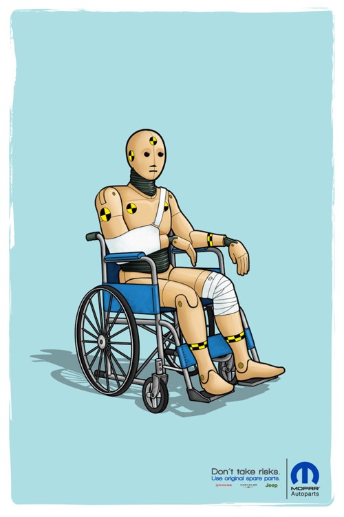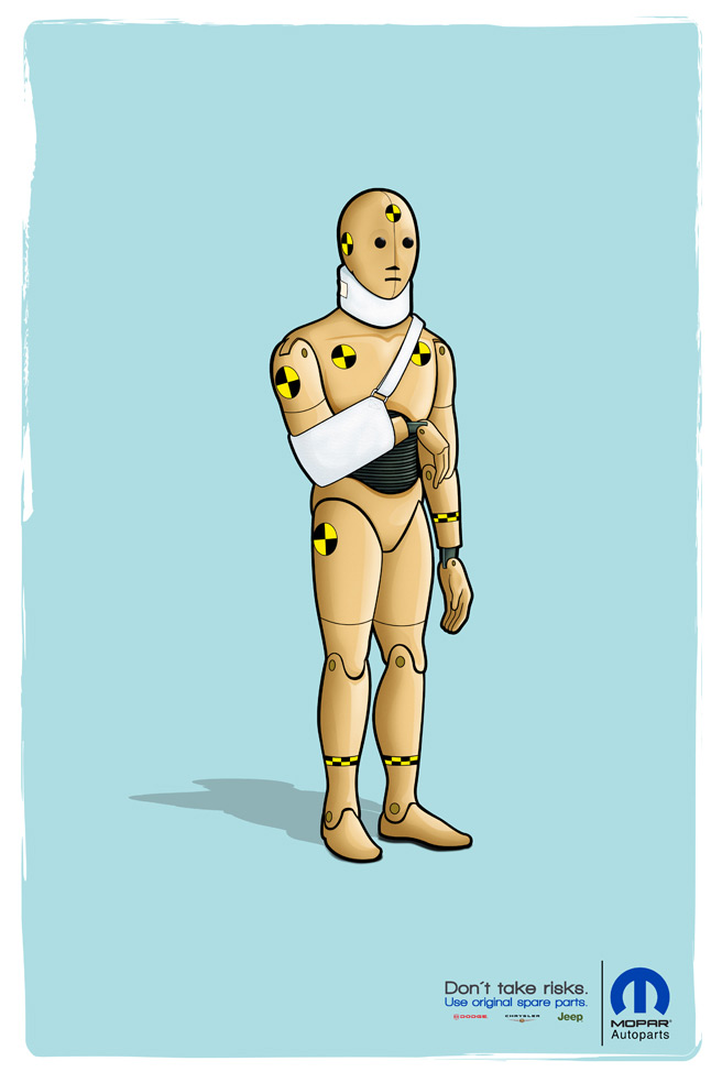 Купите настоящие запчасти и будьте спокойны"Здоровье гораздо важнее экономии денег," - напоминает всем Mopar Autoparts Service, изготовитель запчастей для автомобилей с мировым именем. Принты их новой рекламной кампании от мексиканского креативного агентства BBDO наглядно демонстрируют, что именно может случиться с тем водителем, который захочет купить что-то подешевле, но непонятно где и кем изготовленное.Слоган: Не рискуйте. Используйте настоящие запчасти. Advertising Agency: BBDO Mexico Executive Creative Director: Hictor Fernandez Creative Directors: Carlos Oxti, Agustn Esteban Art Director: Mario Berber Illustrator: Marco Onofre Account manager: Eduardo Delgado Copywriter: Raul Pineda |