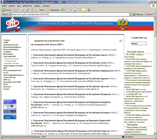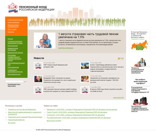 Пенсионный фонд открыл новый сайт16 сентября 2009 года Пенсионный фонд Российской Федерации открыл новый официальный интернет-сайт. Он разработан московской компанией «Notamedia» и, по сути, представляет собой объединенный интернет-портал всей системы ПФР, которая охватывает всю территорию России. Под каждое из 82 отделений ПФР в субъектах Российской Федерации был создан фактически отдельный мини-сайт в структуре общего ресурса. Перейти на страницы отделений можно как с помощью интерактивной карты, так и из стандартного каталогизированного списка. Посетителям доступны все сведения об отделении, график работы и приема граждан, последние новости. На каждой странице есть online-приемная, где можно задать вопрос специалистам отделения. Специалистам отделений предоставлен доступ к дополнению и редактированию информации в своем разделе, благодаря чему данные на сайте ПФР всегда будут поддерживаться в актуальном состоянии. «Главная цель, к которой мы стремились, разрабатывая новый сайт, – это повышение информационной открытости Пенсионного фонда, что особенно важно в период вступления в действия новых пенсионных законов», – отметил Председатель Правления ПФР Антон Дроздов. «Каждый посетитель должен получить ответ на интересующий его вопрос, узнать о деятельности Фонда, существующей пенсионной системе и мерах Правительства РФ по ее совершенствованию», – подчеркнул он. Основное меню сайта содержит две части. В первой представлена подробная информация о деятельности Пенсионного фонда, последние новости, выступления и интервью руководителей Фонда, сведения о деятельности управляющих компаний и негосударственных пенсионных фондов. БЫЛО