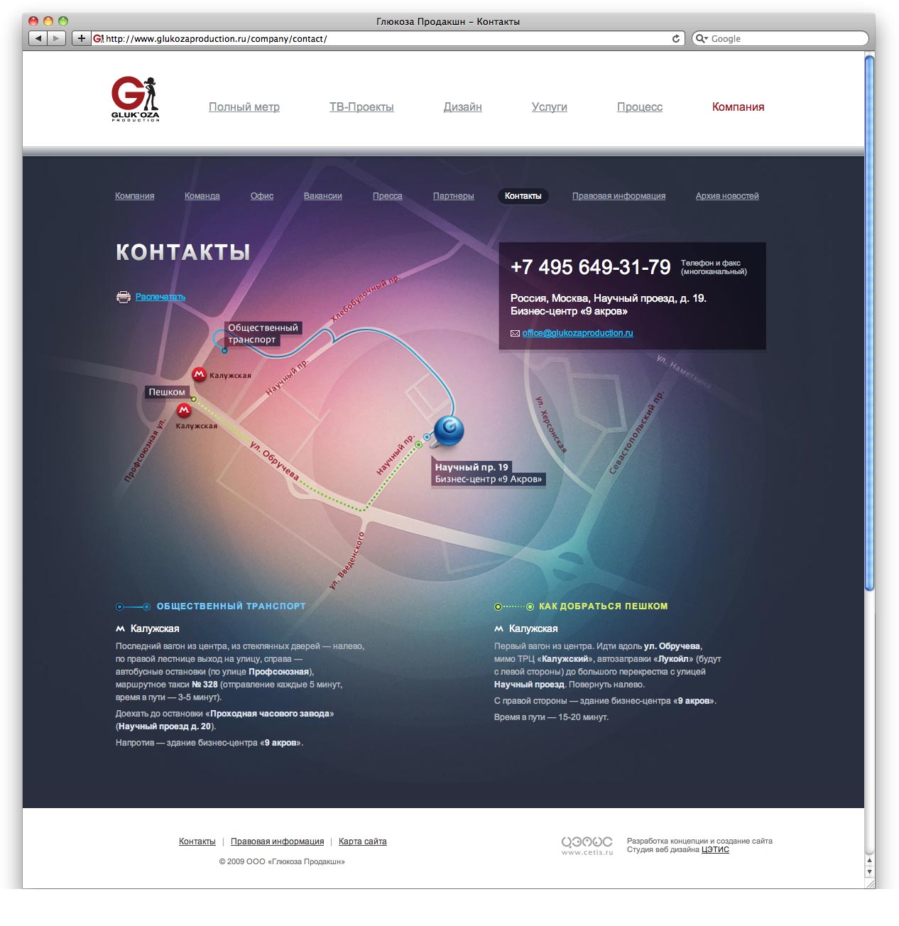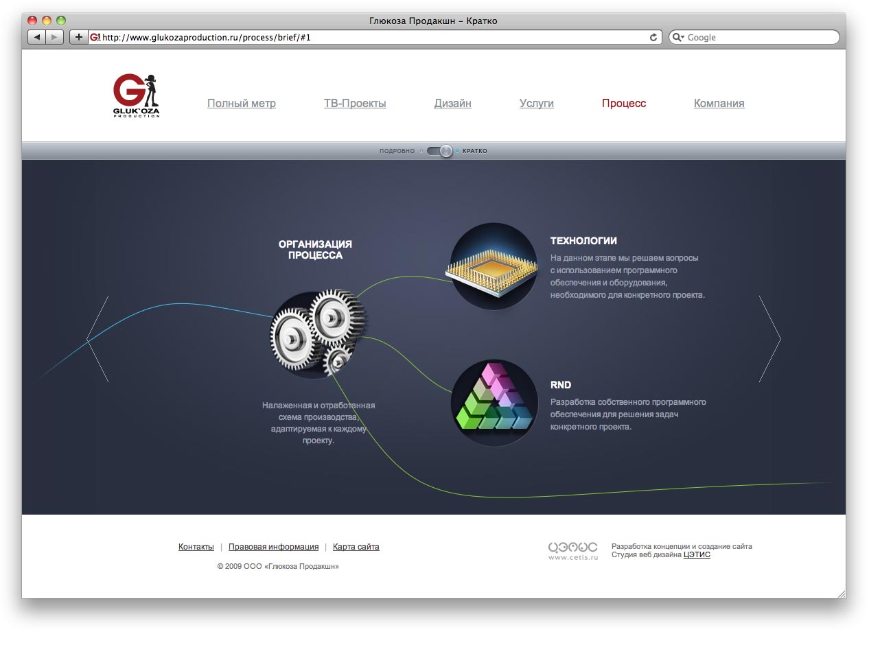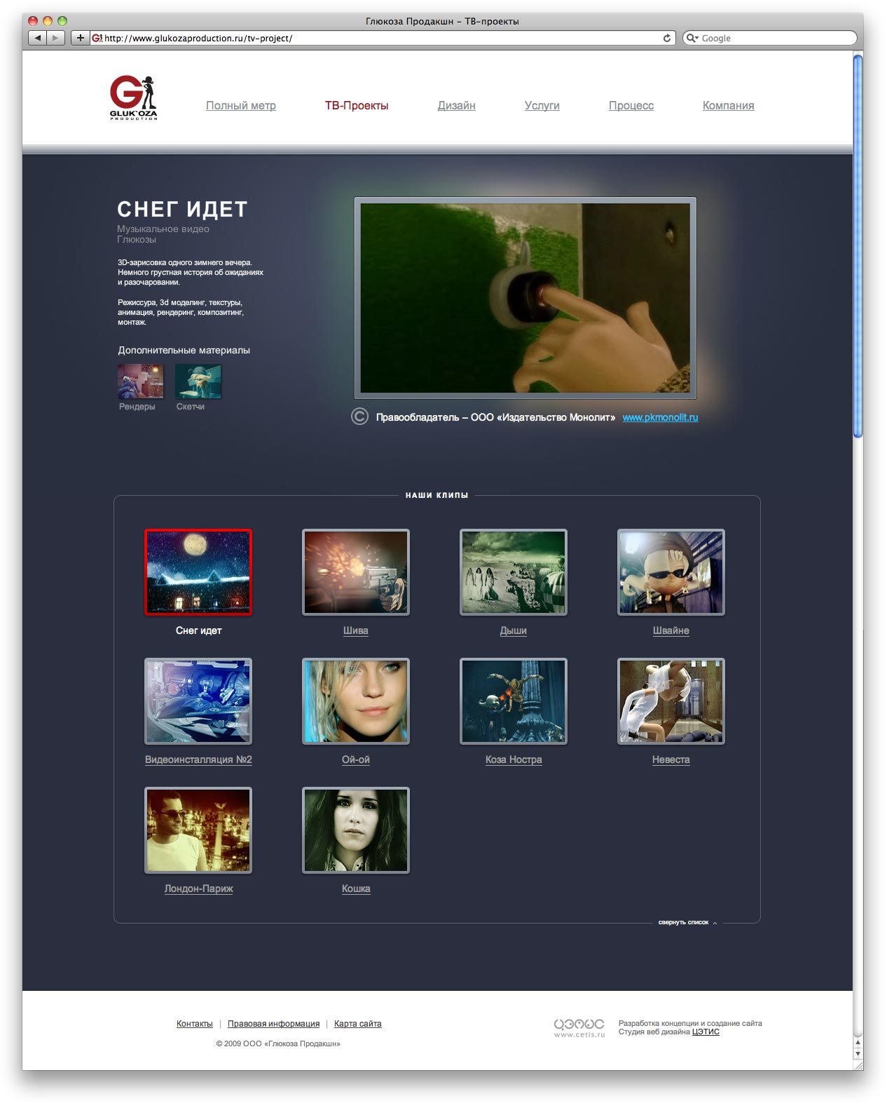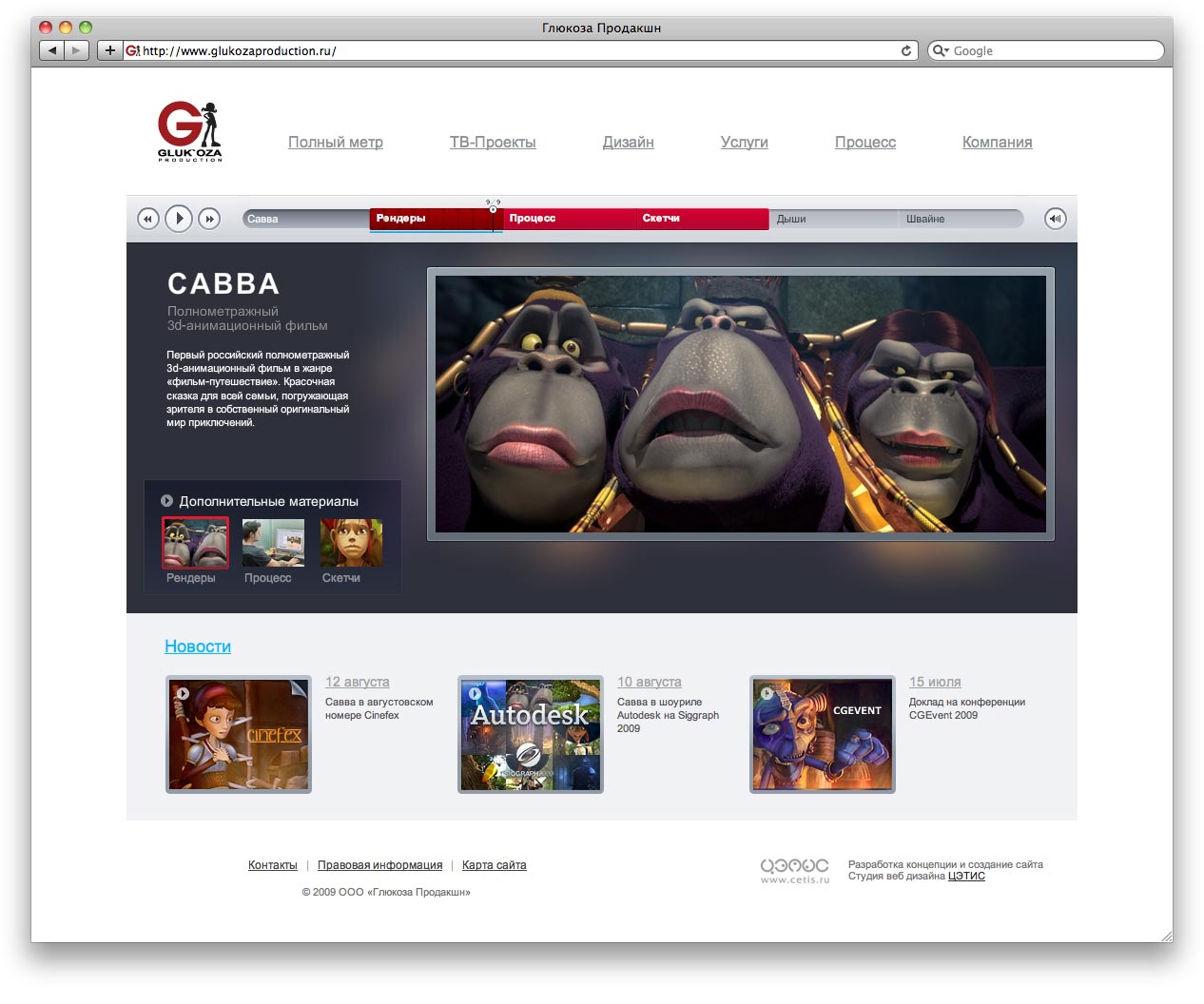 GLUK'OZA заказала сайт студии "Цэтис"Студия "ЦЭТИС" создала сайт для GLUK'OZA Production - российской анимационной студии, предлагающей рынку полный арсенал графических решений, основанных на мировых стандартах качества 3D-индустрии.Находясь в продакшн-студии, посетитель должен постоянно ощущать движение вокруг, жизнь, работу, поэтому на сайте реализовано множество интерактивных динамических элементов. Ресурс является примером создания эффективных элементов юзабилити и программирования высокой сложности. Сайт создан с использованием уникальных современных технологий. Одна из них - Ambilight, впервые в России реализована для любого типа контента, включая видео и статические графические изображения. |