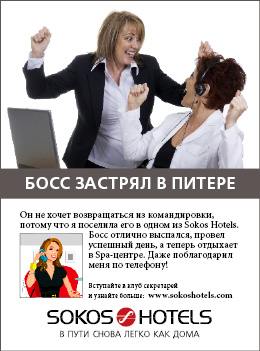 Promaco собирает армию секретарейВ новой рекламной кампании от PromacoВ начале сентября маркетинговое агентство Promaco запустило "Секретарскую" кампанию для финской гостиничной сети Sokos Hotels. Чтобы привлечь в отели бизнес-путешественников, Promaco решило обратиться к тем, кто деловые поездки организует - к секретарям и личным помощникам директоров. В руках секретаря большая власть: от выбора отеля зависит то, насколько хорошо выспится его босс, как успешно пройдет его поездка и в каком настроении он из нее вернется. Чтобы донести это сообщение, Promaco использует как традиционные рекламные носители (модули в прессе, радиоролики и Интернет-баннеры), так и креативные каналы коммуникации. В московские офисы рекламные стикеры проникают на бутылках с питьевой водой, а открытки - вместе со счетами-фактурами после оплаты номера в гостинице по безналичному расчету. Кампания ставит цель создать единое российское, а со временем, возможно, и международное сообщество секретарей. В социальной сети "В Контакте" Promaco развивает группу "Клуб секретарей, которые решают!". Ее участники обмениваются опытом, участвуют в обсуждениях и розыгрышах от Sokos Hotels, а также получают информацию о новых акциях и предложениях отелей сети. На сегодняшний день в группе уже более 800 активных участников.