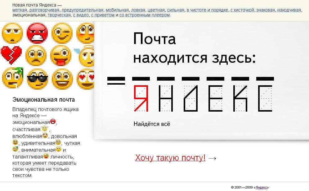 "Яндекс" рассказывает про новую почтуIn-house-креатив на щитах бывшего СССРВ конце августа сервис "Яндекс.Почта" качественно изменился - как интерфейсно, так и технологически. В поддержку этих изменений компания "Яндекс" запустила рекламную кампанию, задача которой состояла в том, чтобы рассказать пользователям о новых возможностях сервиса. Изначально кампания планировалась только на размещение в Интернете, но в результате была задействована и наружная реклама. "Визуальная реализация промо-проекта нам так понравилась, - рассказала Sostav.ru Светлана Кондрашова, директор по рекламе компании "Яндекс", - Что мы решили порадовать ею и аудиторию вне интернета". География размещения макетов в наружной рекламе охватил три страны бывшего СССР - Россию, Украину и Белоруссию. Также макеты, промотирующие новую "Яндекс-почту", размещены в метрополитене. Рекламная кампания полностью разработана творческой группой компании "Яндекс". Размещение, сроки которого очерчивают период с середины сентября до середины октября, осуществляет рекламная группа компании "Яндекс". Евгения Кузнецова, Sostav.ru Новый дизайн блока входа в Яндекс.Почту - на главной странице "Яндекса":