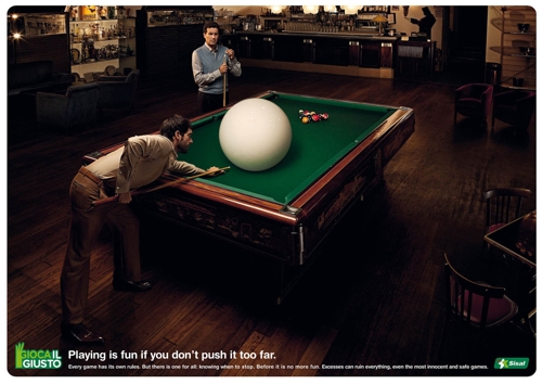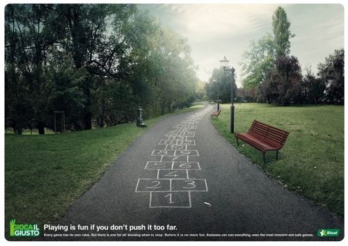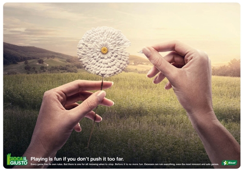 Все хорошо в меруИтальянская социальная реклама против азартных игрМиланское агентство Grey в своей рекламе для компании Sisal, концессионеру азартных инрв в Италии, пошло иным путем, чтобы предупредить игроманию, нежели канадское Doner Canada, сравнившее азартные игры с наркотиками. В кампании итальянцев акцент сделан на том, что играть, в общем-то, можно, но лишь до тех пор, пока азарт не разрастается и не заполняет собой весь мир игрока. "Игра - это веселье, если не заходишь слишком далеко", - сообщает слоган. А пояснение ниже продолжает тему: "У каждой игры есть правила. Но есть одно общее для всех - знать, когда нужно остановиться. До тех пор, пока веселье не прошло. Излишества могут испортить все, даже самые невинные и безопасные игры". Например, гадание на лепестках ромашки или забавы с резиновой уткой в ванной. Состав творческой группы Advertising Agency: Grey, |