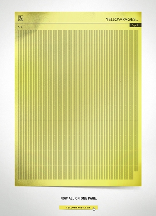 Одна желтая страницаРеклама сайта Yellowpages.comЛаконичная печатная реклама от популярнейшего справочника Yellow Pages. Не так давно издание вышло в сеть и теперь по сути одна веб-страница представляет собой весь справочник от начала и до конца. Слоган "Теперь все на одной странице" лишний раз подчеркивает, что даже такой консервативный элемент бизнеса как "Желтые страницы" в конце концов поддался влиянию digital-эпохи. Состав творческой группы Creative: Ronny & Nick ![]() |